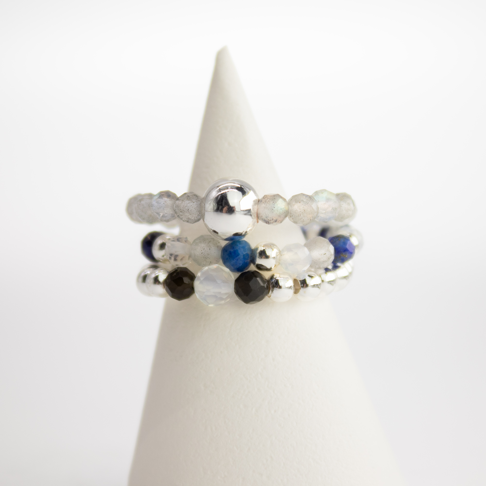 Each ring reflects a different mood, from the deep blues of lapis to the iridescent glow of labradorite and opalite. Worn together, the rings create a layered, expressive look that feels playful yet intentional.