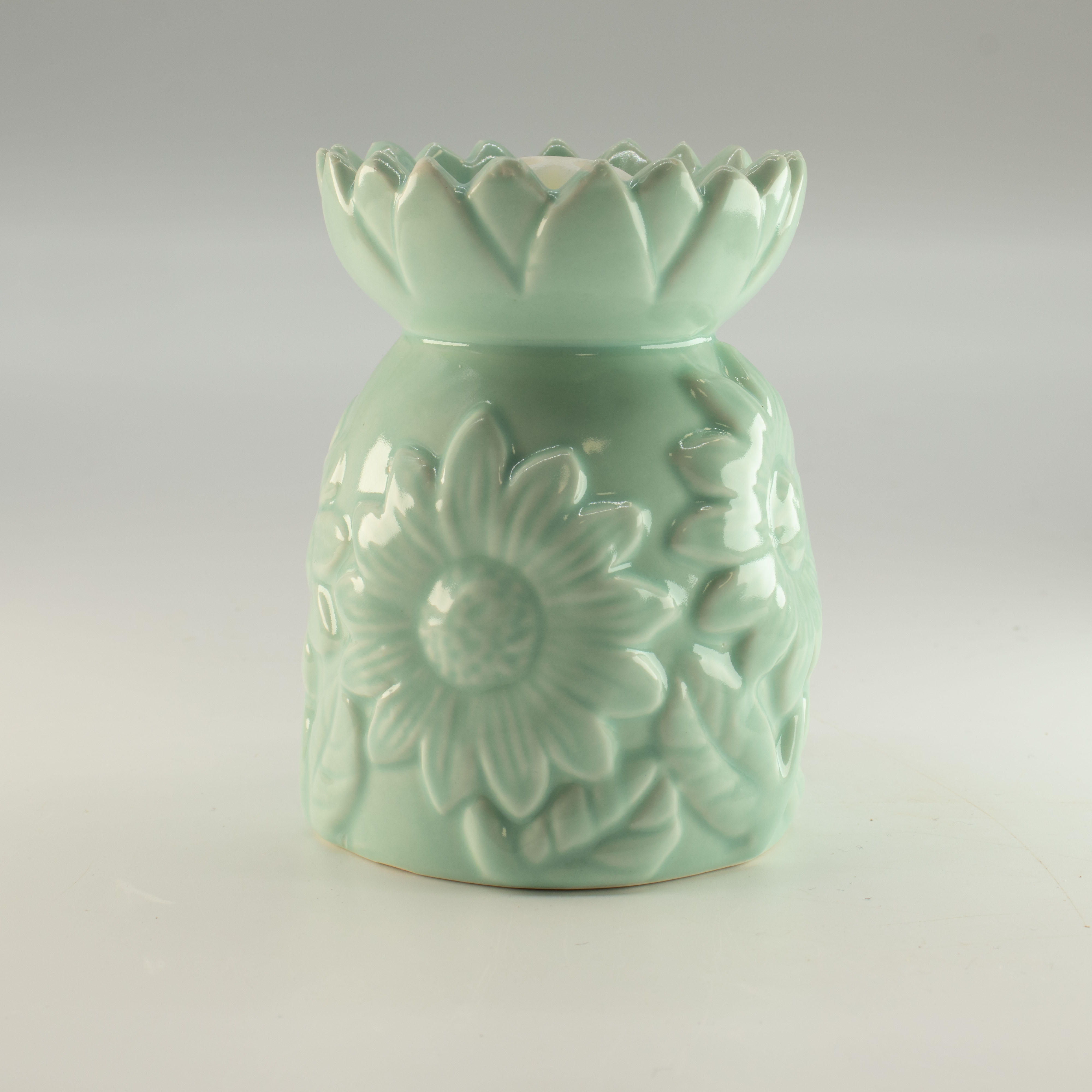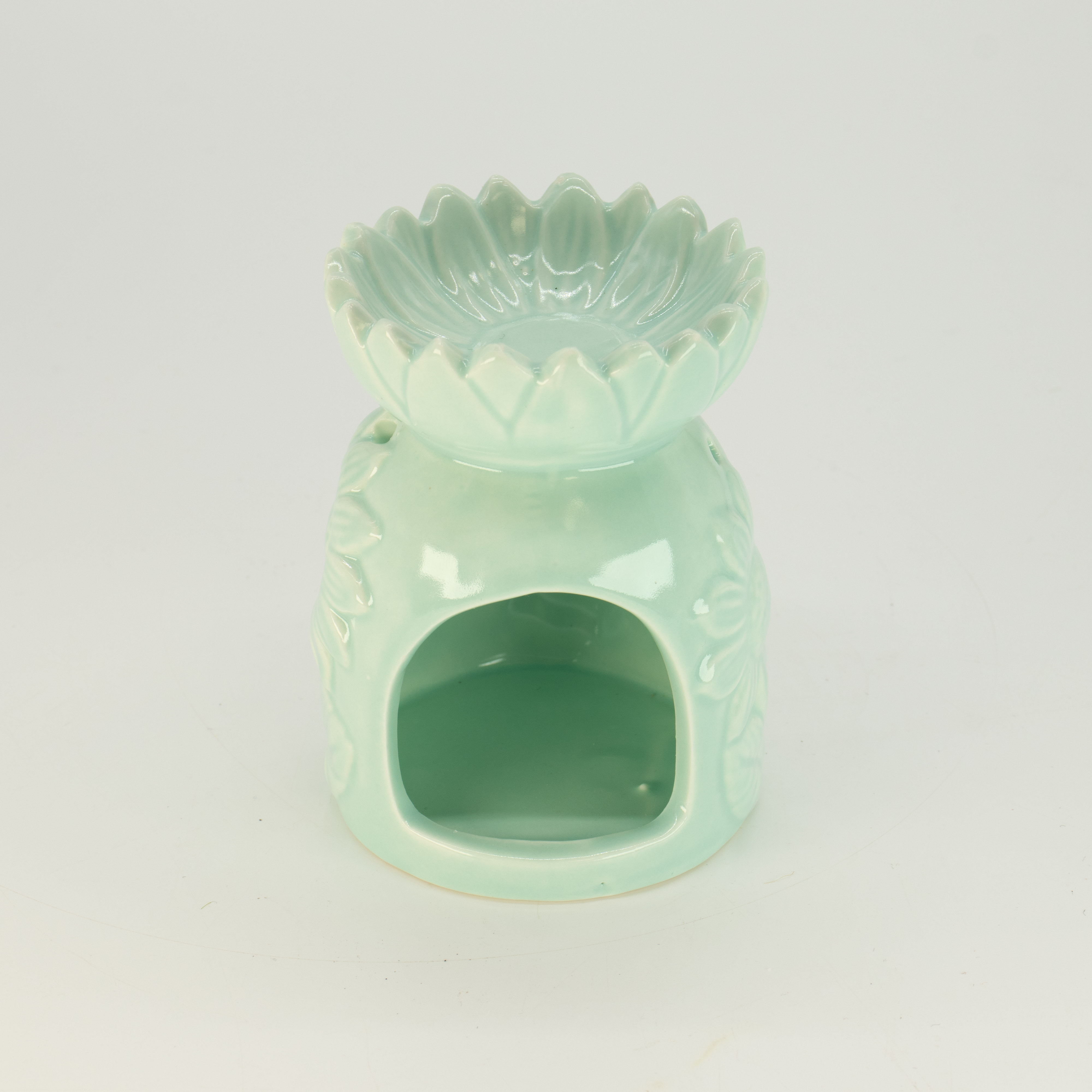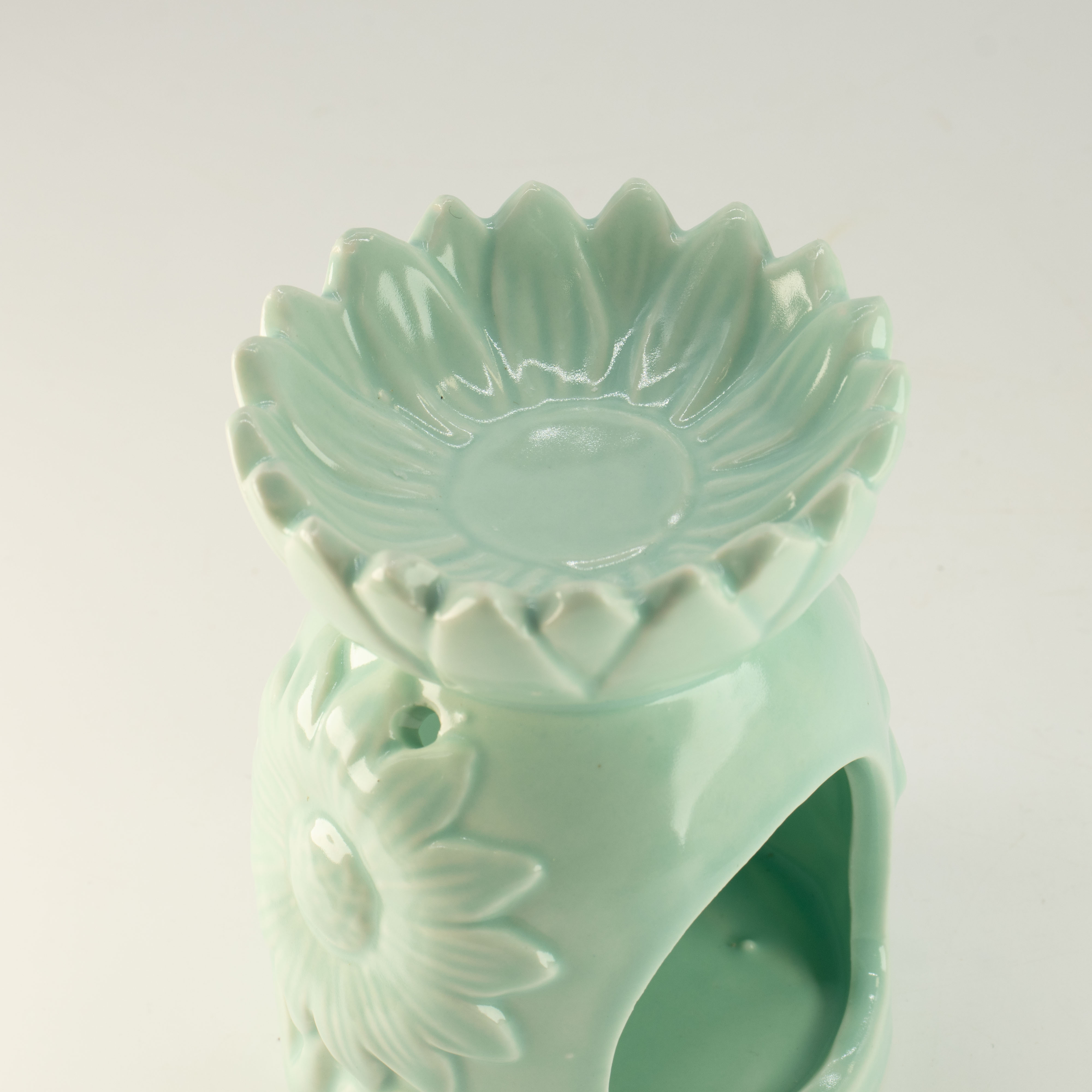 A soft pastel green oil burner with a delicate sunflower-shaped bowl, designed to bring a gentle, nature-inspired touch to any space. The glossy ceramic finish gives it a clean, fresh look that fits beautifully into gift shops, home fragrance displays and wellness ranges.