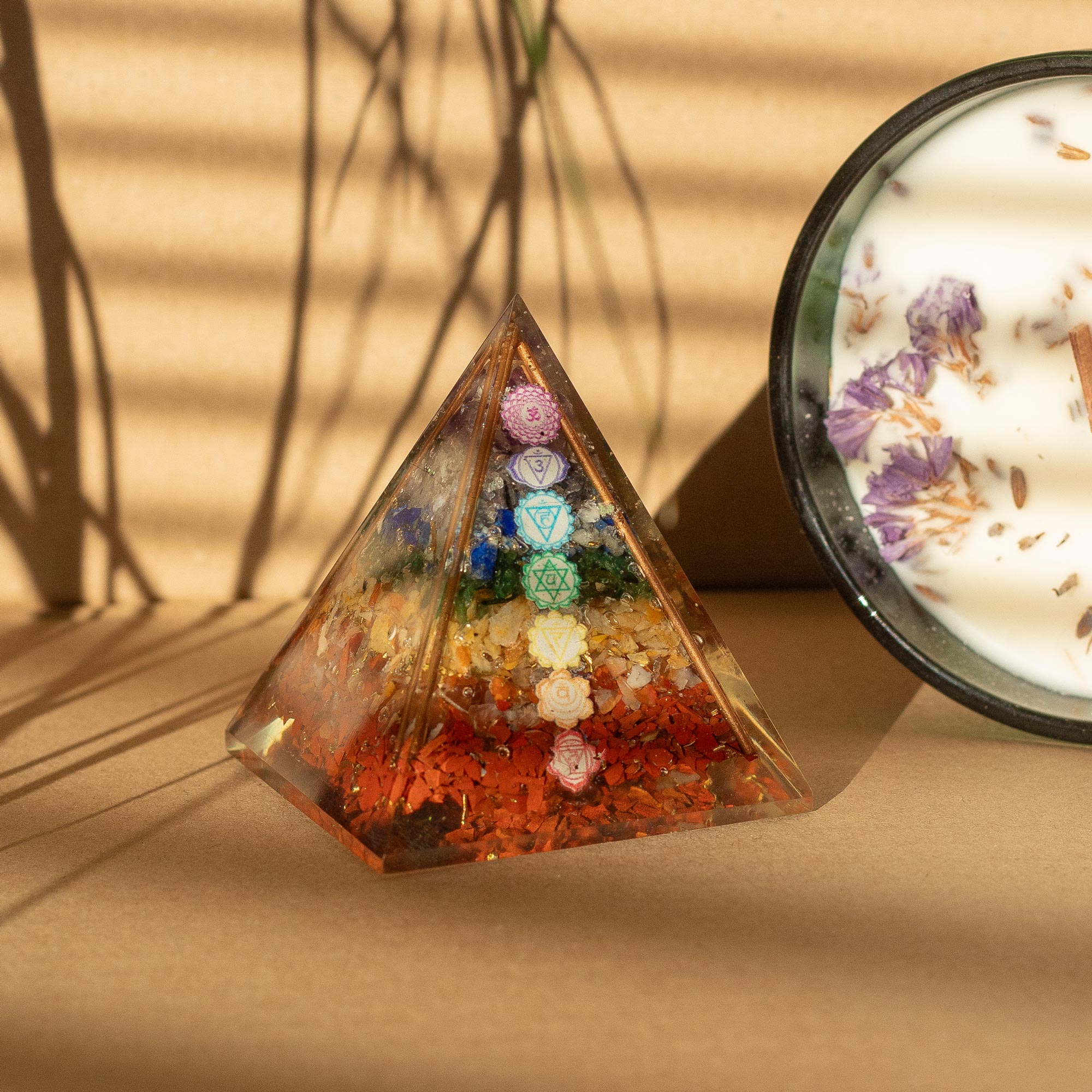 This beautiful Pyramid is filled with healing crystal chip stones with a Om Chakra Design.