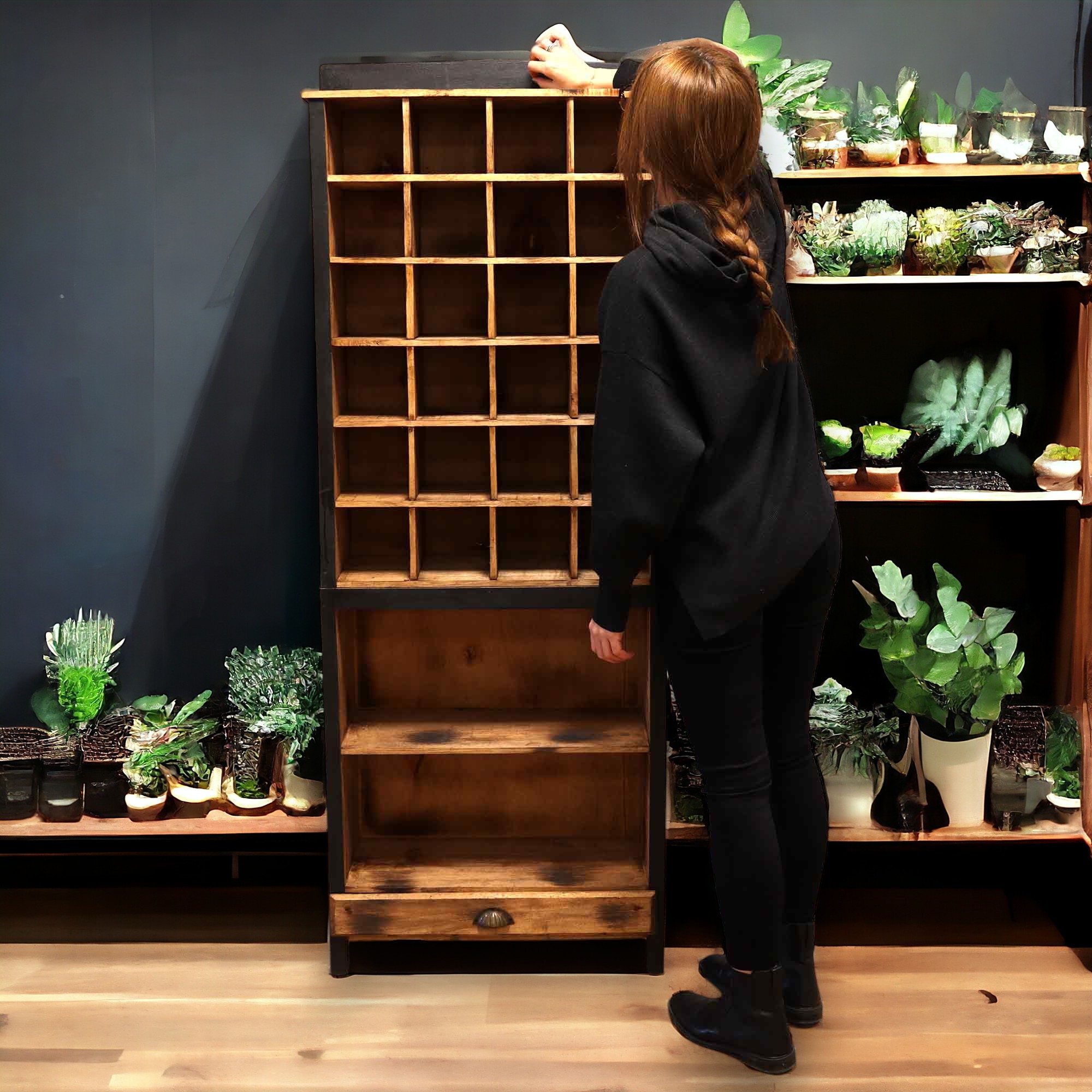 The unique design with square compartments allows for aesthetic product arrangement. This is an ideal solution for presenting smaller items, accessories or trinkets. You can place more bigger items on two larger shelves. An additional drawer at the bottom of the stand provides hidden space for storing items that may not necessarily be visible to customers.