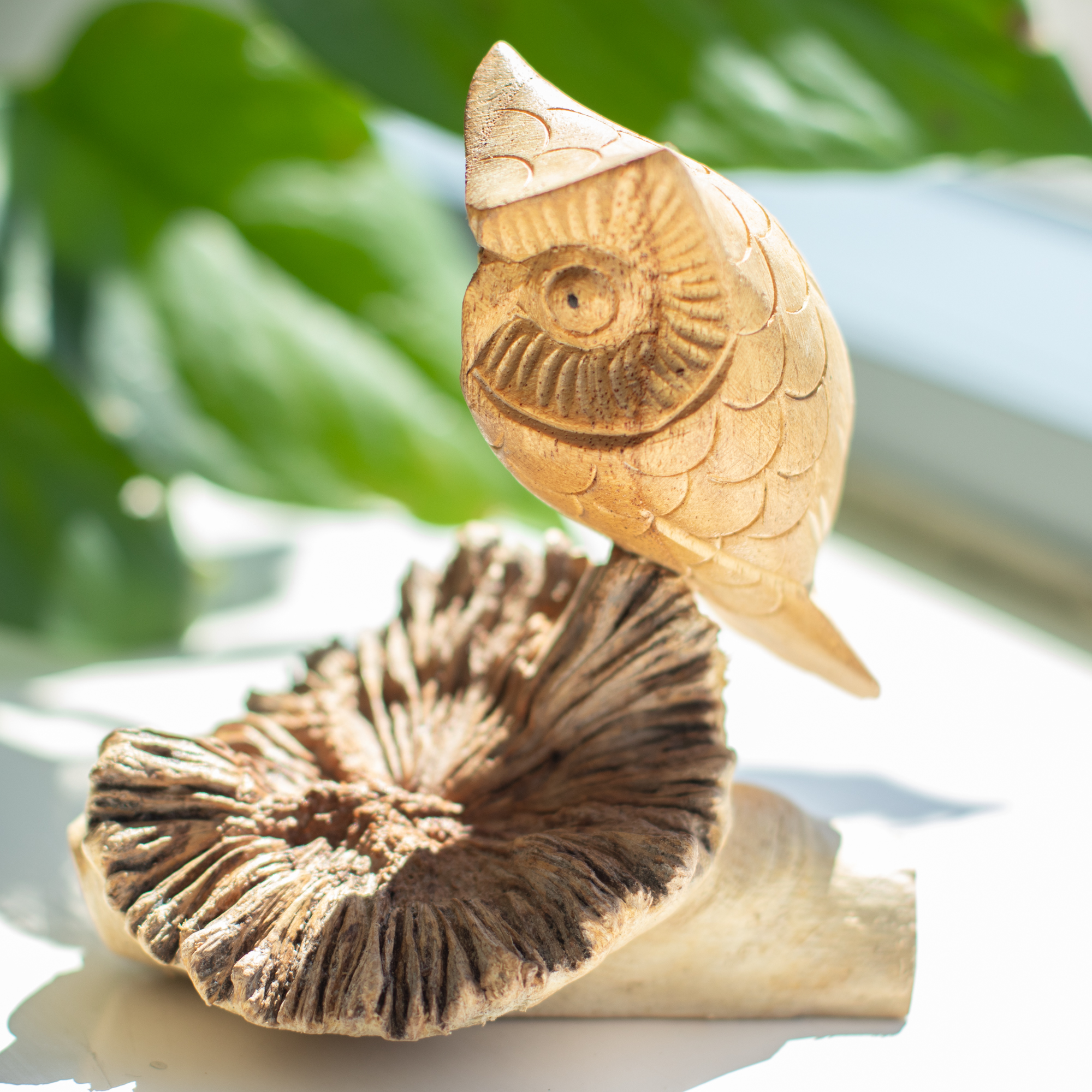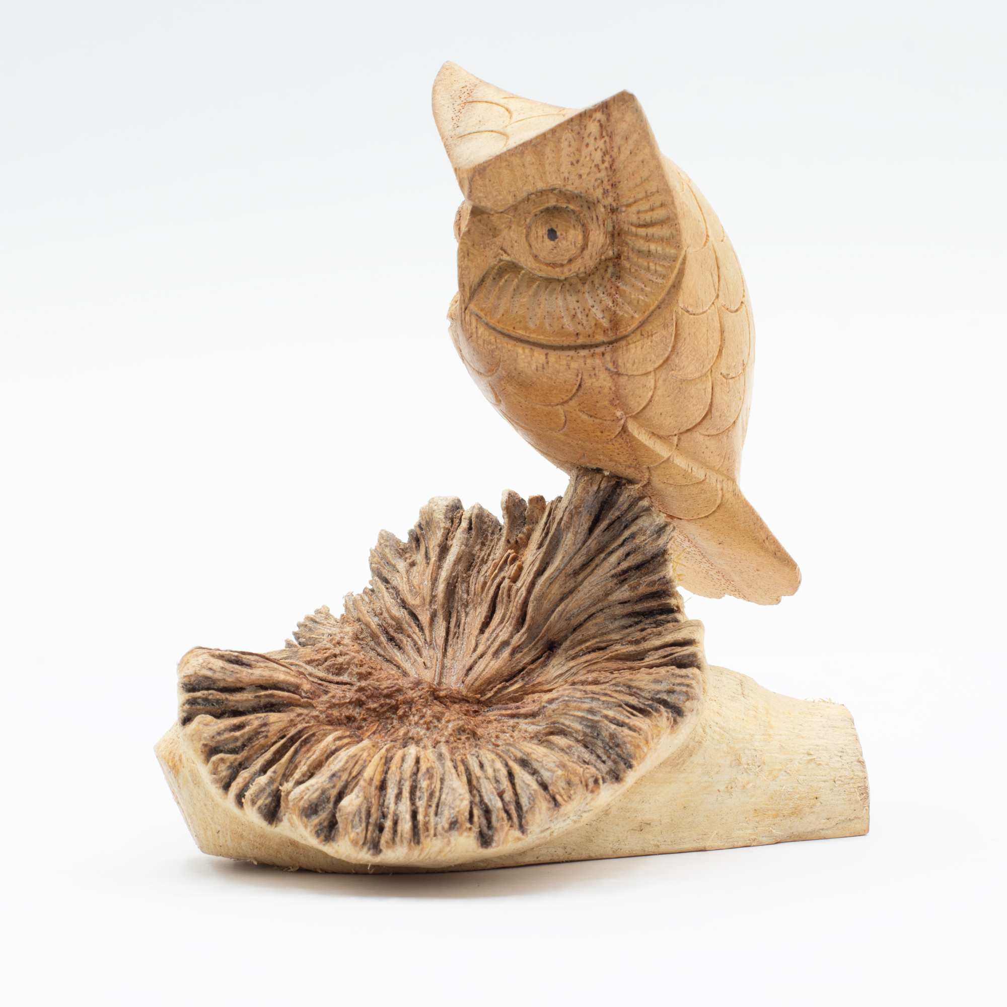 The quietly observant Watching Owl, its like he knows exactly what’s going on in the room. Carved with precision in Indonesia, this piece features a base made from natural parasite wood, while the owl itself is hand-carved from regular timber. Parasite wood is a unique, mushroom-like growth caused by a parasitic plant attaching to a host tree, creating dense, twisted textures that no machine could ever recreate. This natural foundation gives the owl a raw, earthy character that customers immediately recognize as genuine craftsmanship.