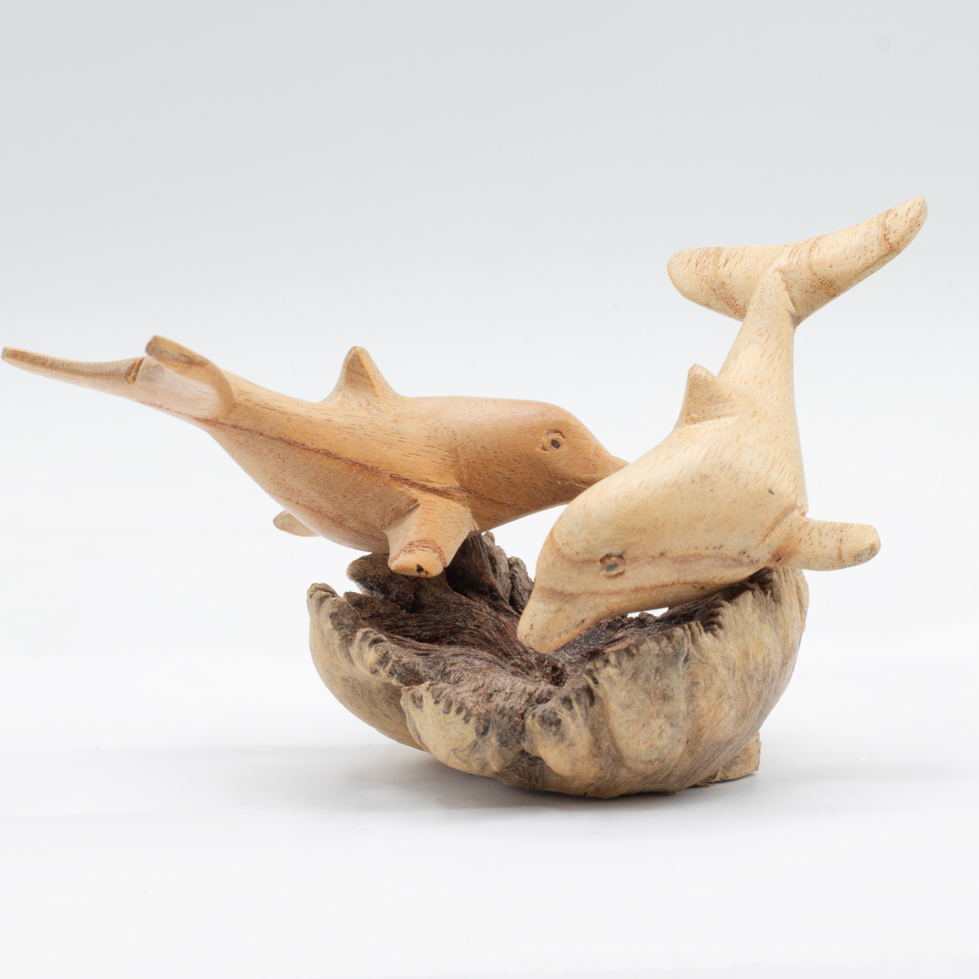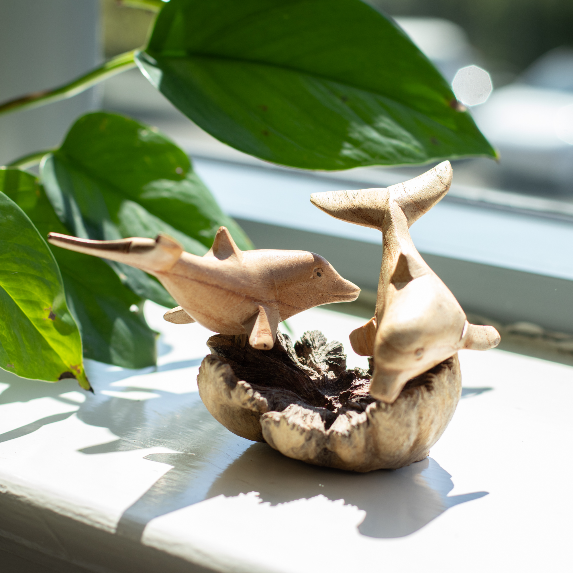 This carving captures the fluid energy of two dolphins caught mid-play, rising from a natural parasite wood base, while the dolphins themselves are hand-carved from regular timber. Parasite wood is a unique, mushroom-like growth caused by a parasitic plant attaching to a host tree; it creates dense, twisted textures that no machine could copy. This natural foundation makes the whole piece feel lively, as if the Indonesian artisan simply followed the flow of the wood to let the dolphins surface naturally.