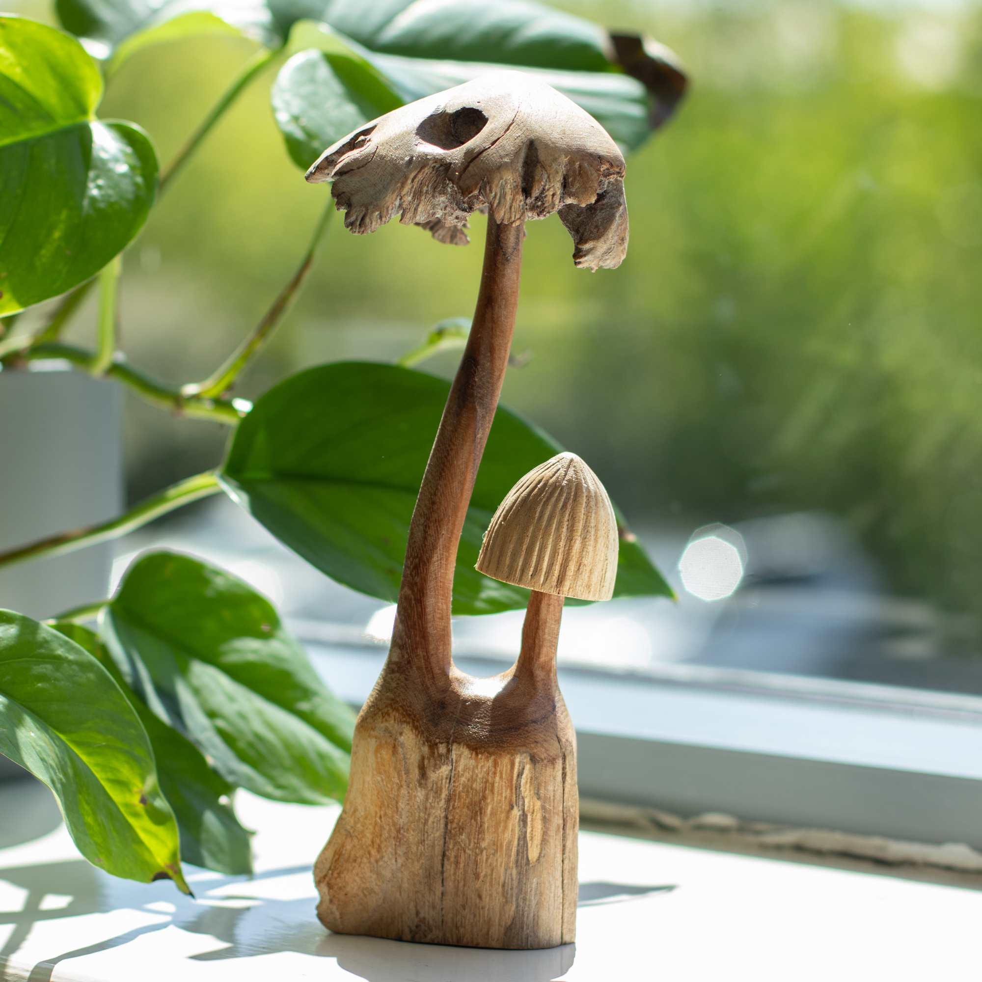 This pair has a lovely, slightly whimsical feel to it, like something you’d expect to stumble across on a quiet woodland walk. Hand-carved in Indonesia, this duo features big mushroom hat made from natural parasite wood, while the rest of the elements are carved from regular timber. Parasite wood isn't a tree species, but a unique, mushroom-like growth caused by a parasitic plant attaching to a host tree. This process creates dense, twisted textures that artisans use to form the caps, giving each mushroom a rugged, organic look that feels almost grown rather than shaped.