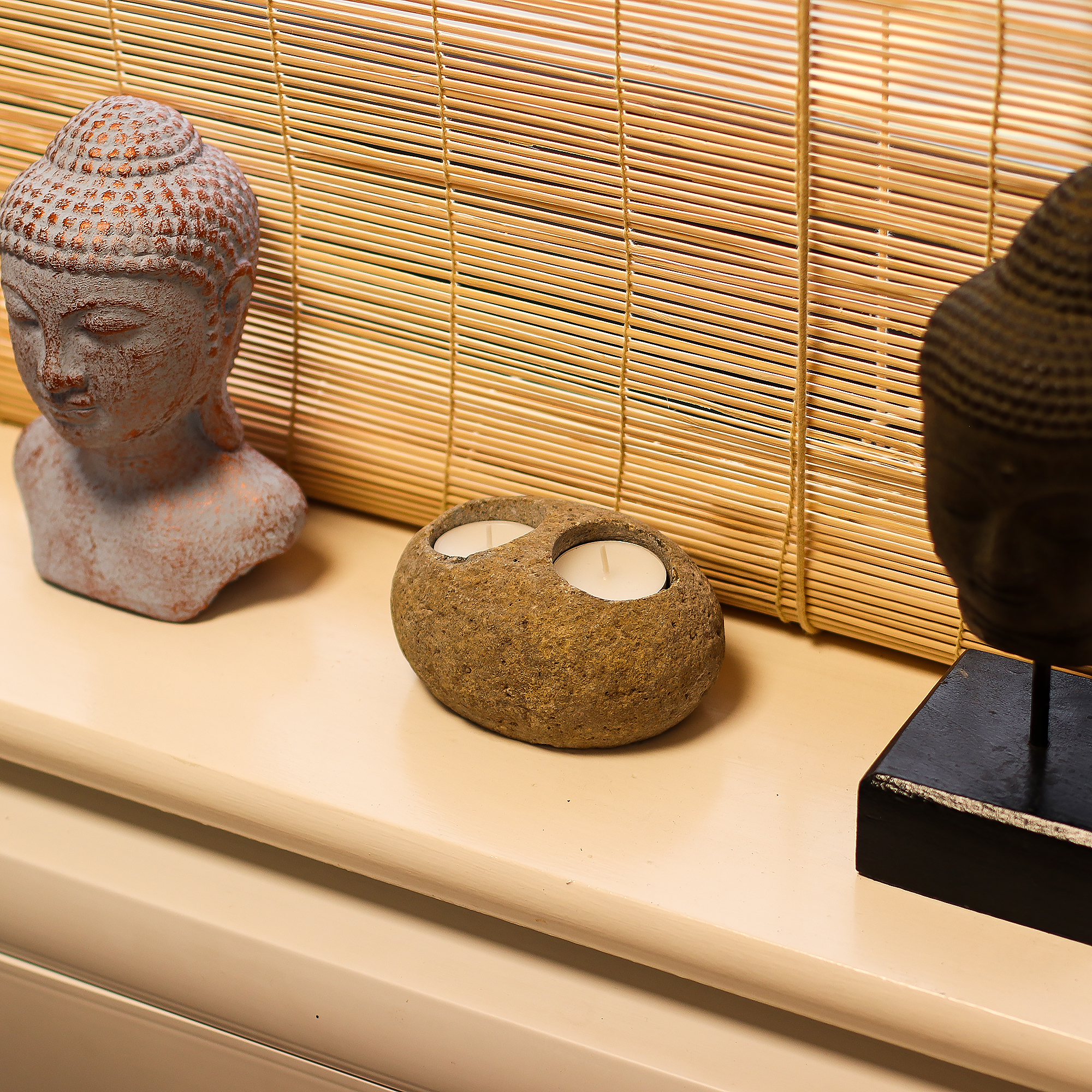 Bring balance and ambiance into your offering with the Riverside Stone Candle Holder – Double. Handcrafted in Indonesia from genuine river stone, this piece accommodates two tea lights in an elegant, organic form. Natural variations in texture, grain, and shade make each unit unique.