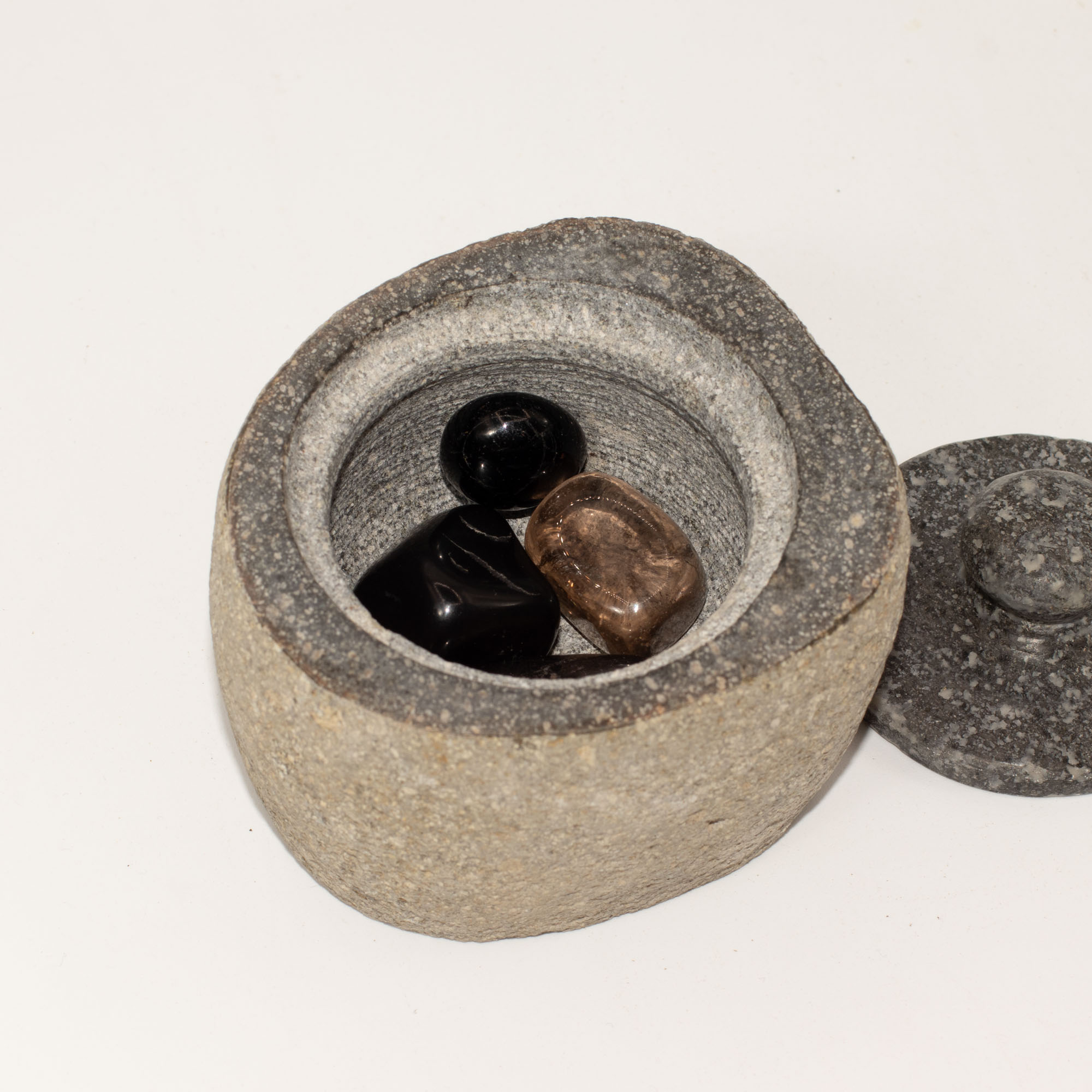 This small grounding pot is carved from solid riverstone, keeping the natural weight, texture, and organic shape of the stone intact. Smooth on the inside and raw on the outside, it feels reassuring in the hand and quietly grounding on any surface.
