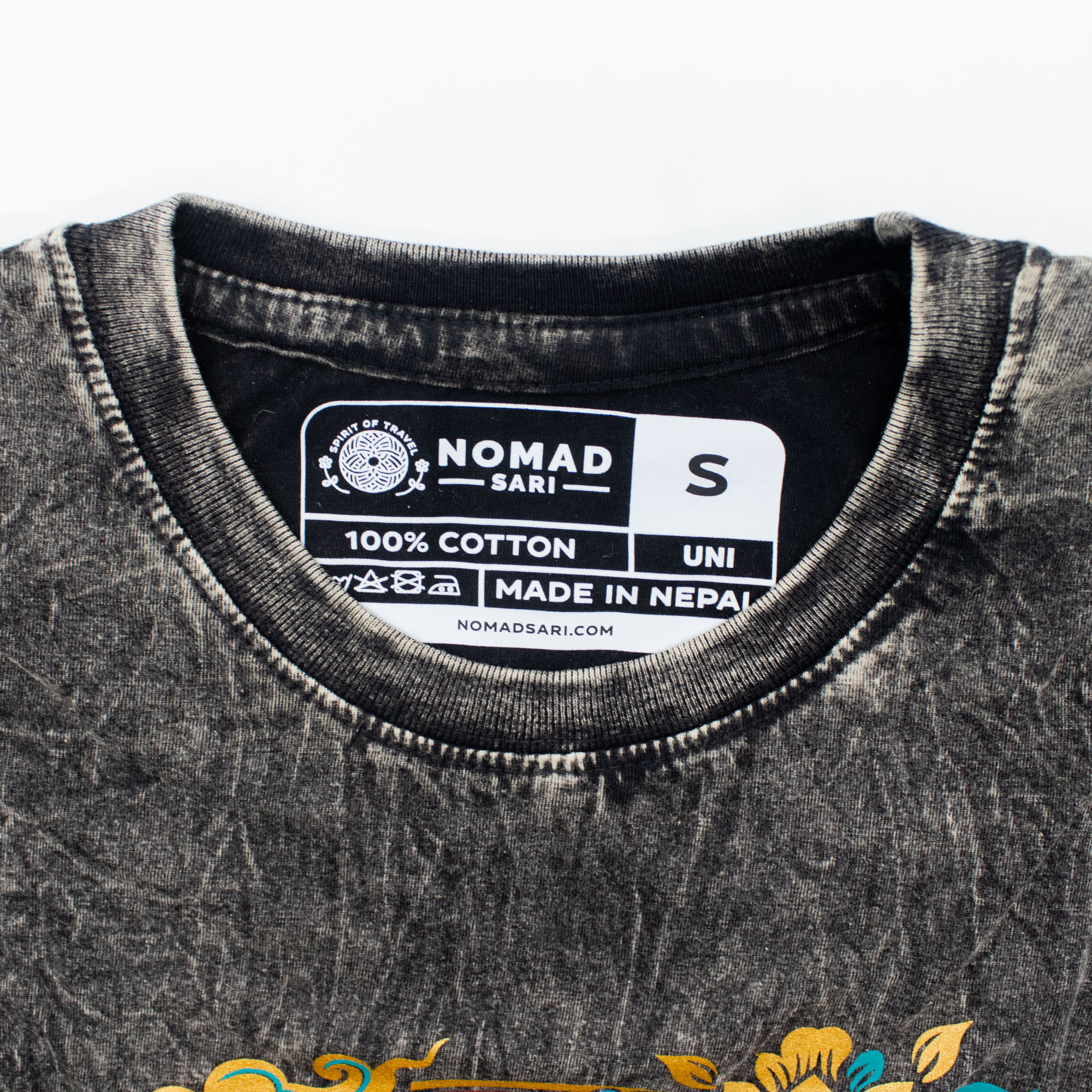 The Nomad Sari collection is designed specifically for the modern wanderer, and the Compass of Life T-shirt serves as a centerpiece for any travel-inspired inventory. The charcoal fabric undergoes a rigorous stone-washing process to achieve a unique, distressed texture that appeals to customers seeking a premium vintage look.