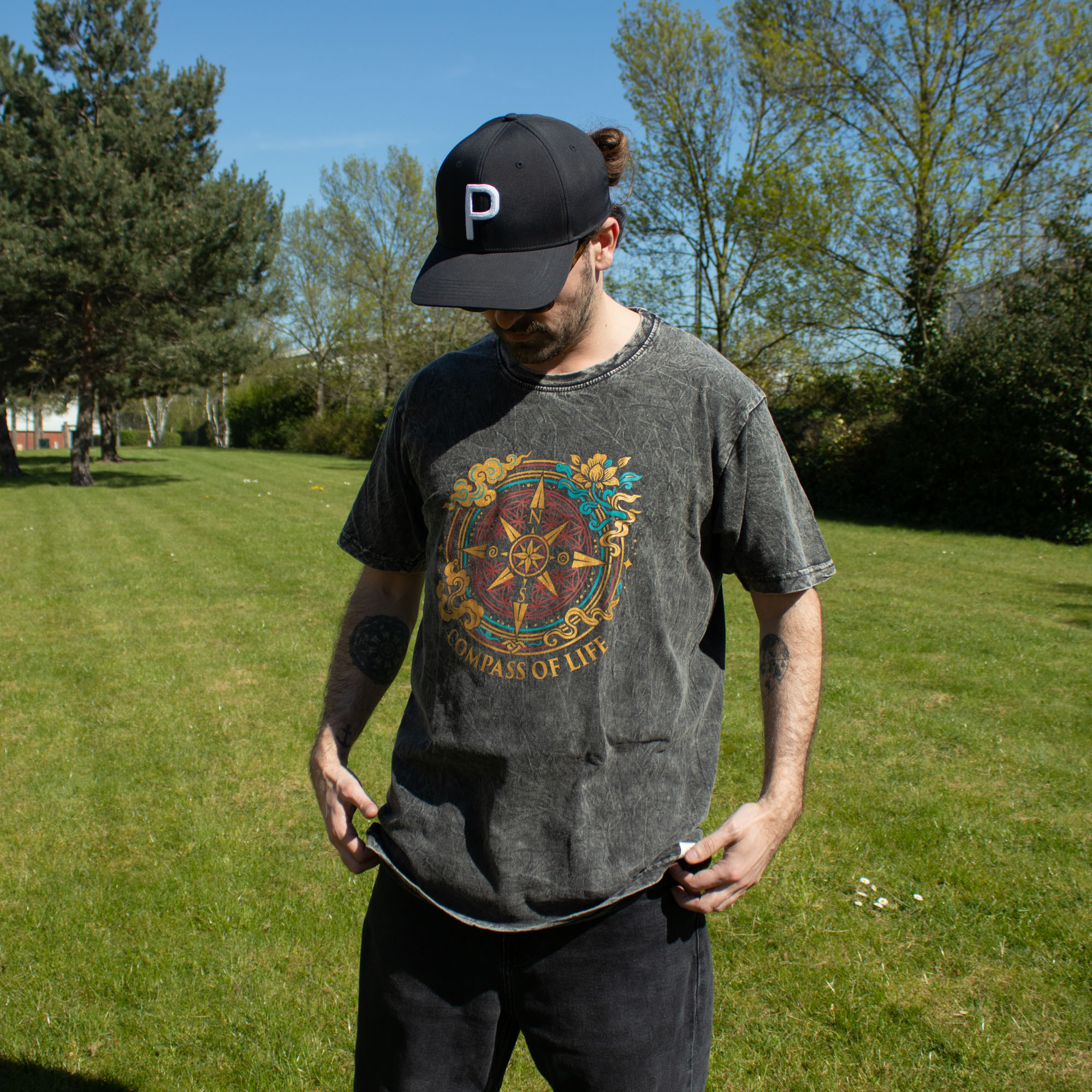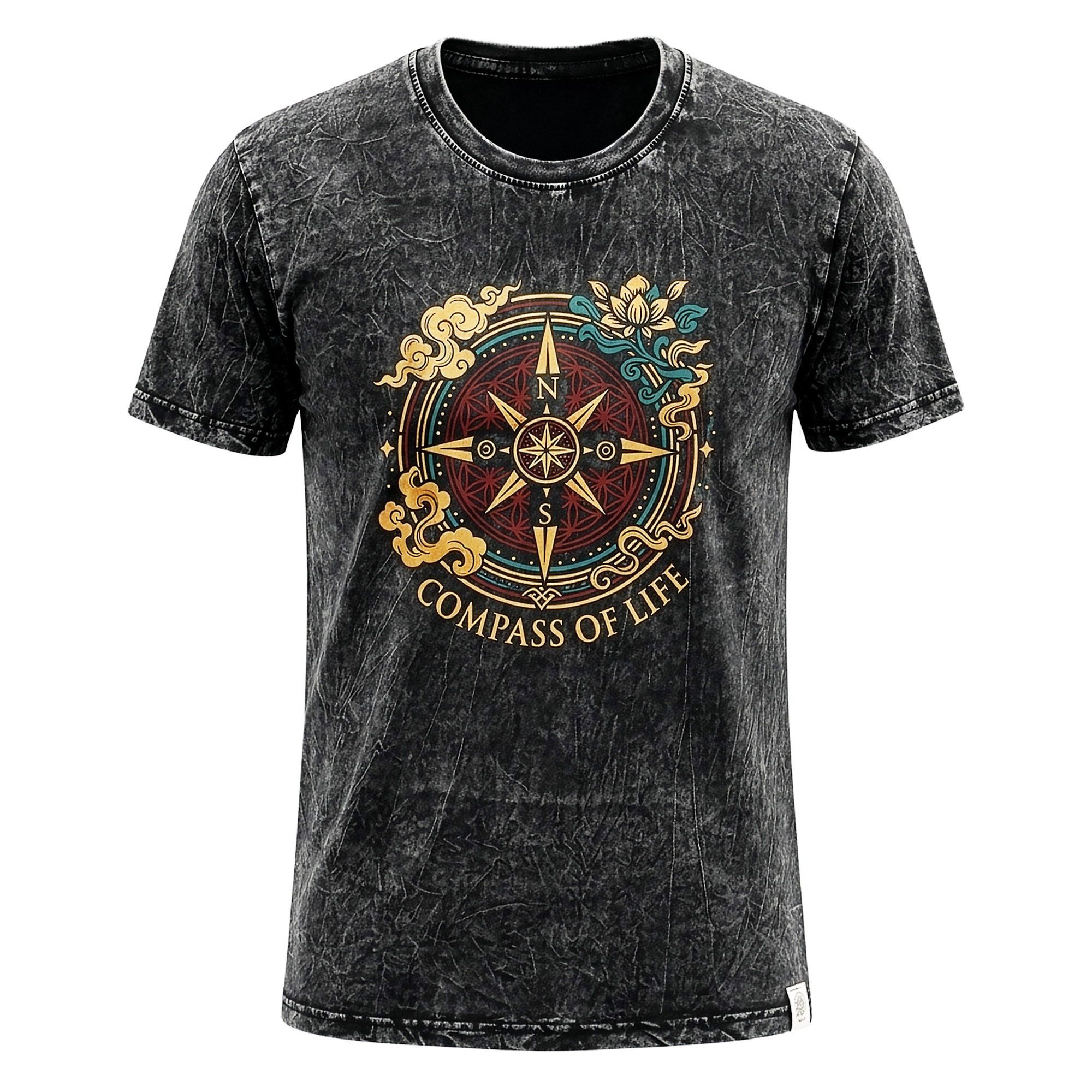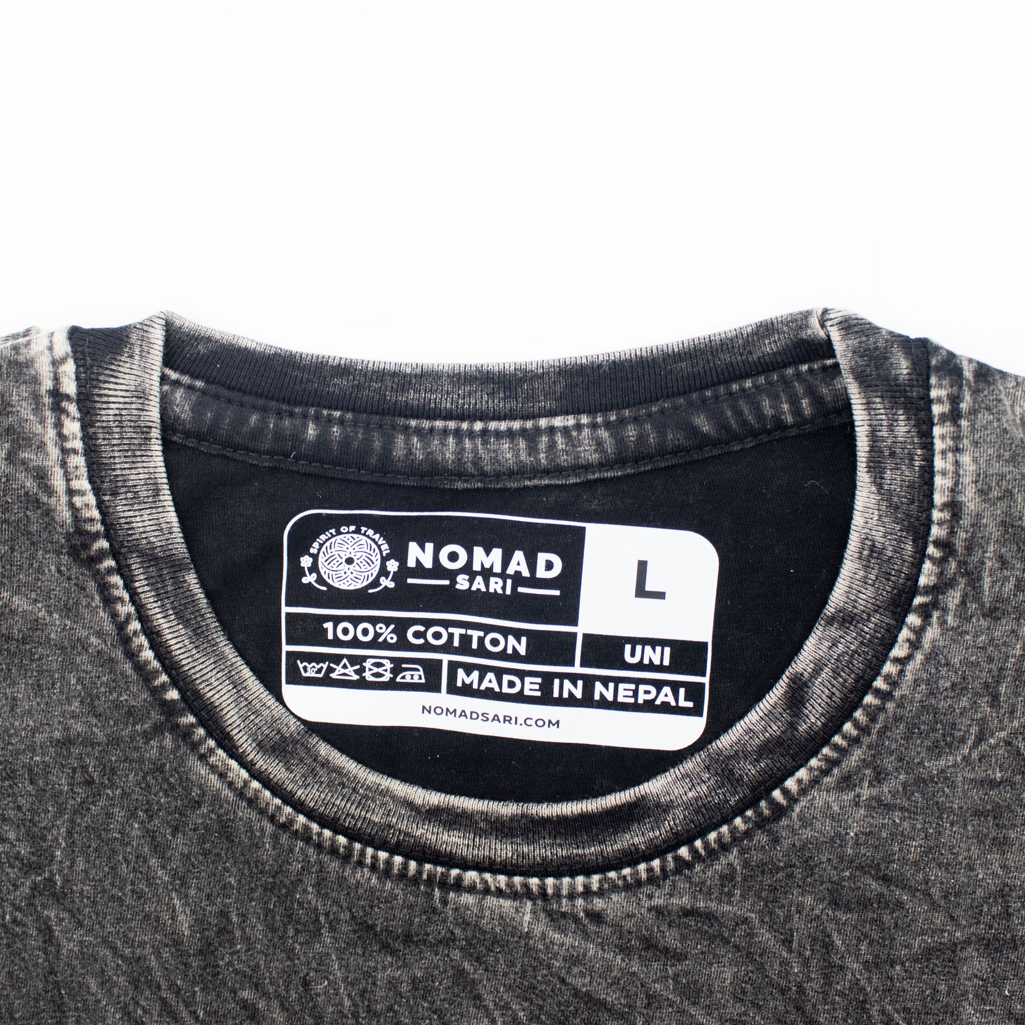 The Nomad Sari Large Compass of Life T-shirt is a must-have for retailers catering to the growing market of adventure-seekers and spiritual travelers. The charcoal base is achieved through a stone-washing process, creating a distressed, lived-in texture that ensures no two shirts are exactly alike.