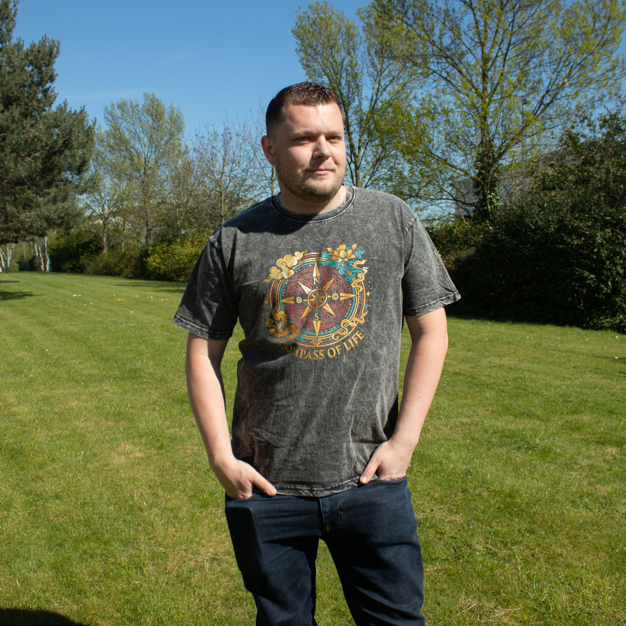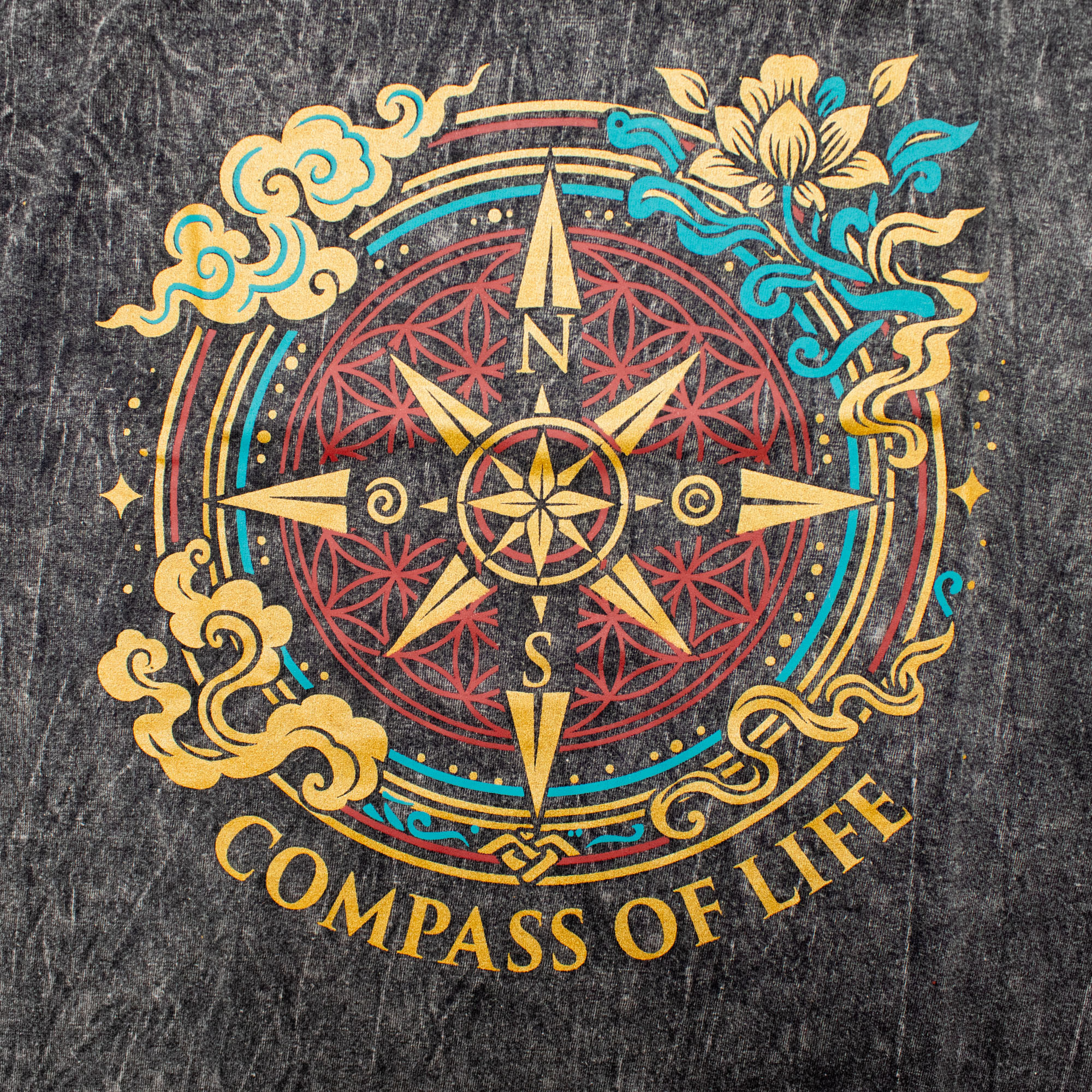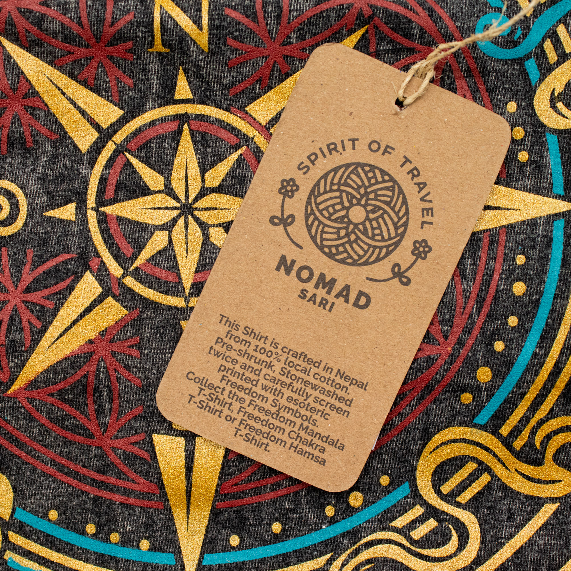 Complete your size run with the Nomad Sari Compass of Life T-shirt in XLarge. This charcoal stone-washed tee features a detailed gold and teal mystical compass design, combining sacred geometry with a vintage wanderlust aesthetic. Built for the modern traveler, it offers a premium, relaxed fit and a rugged, lived-in feel that ensures high visibility and strong sales potential in any retail setting.