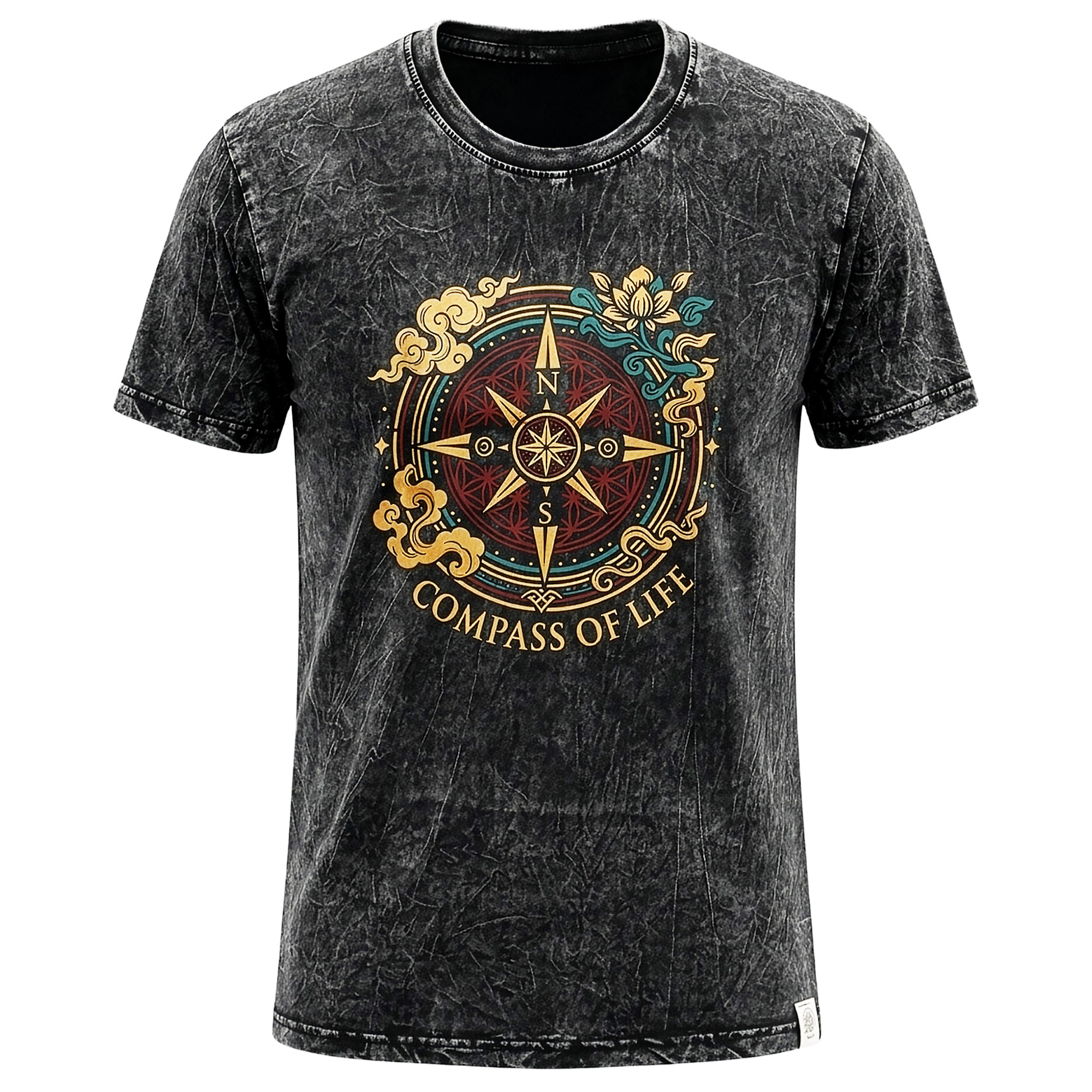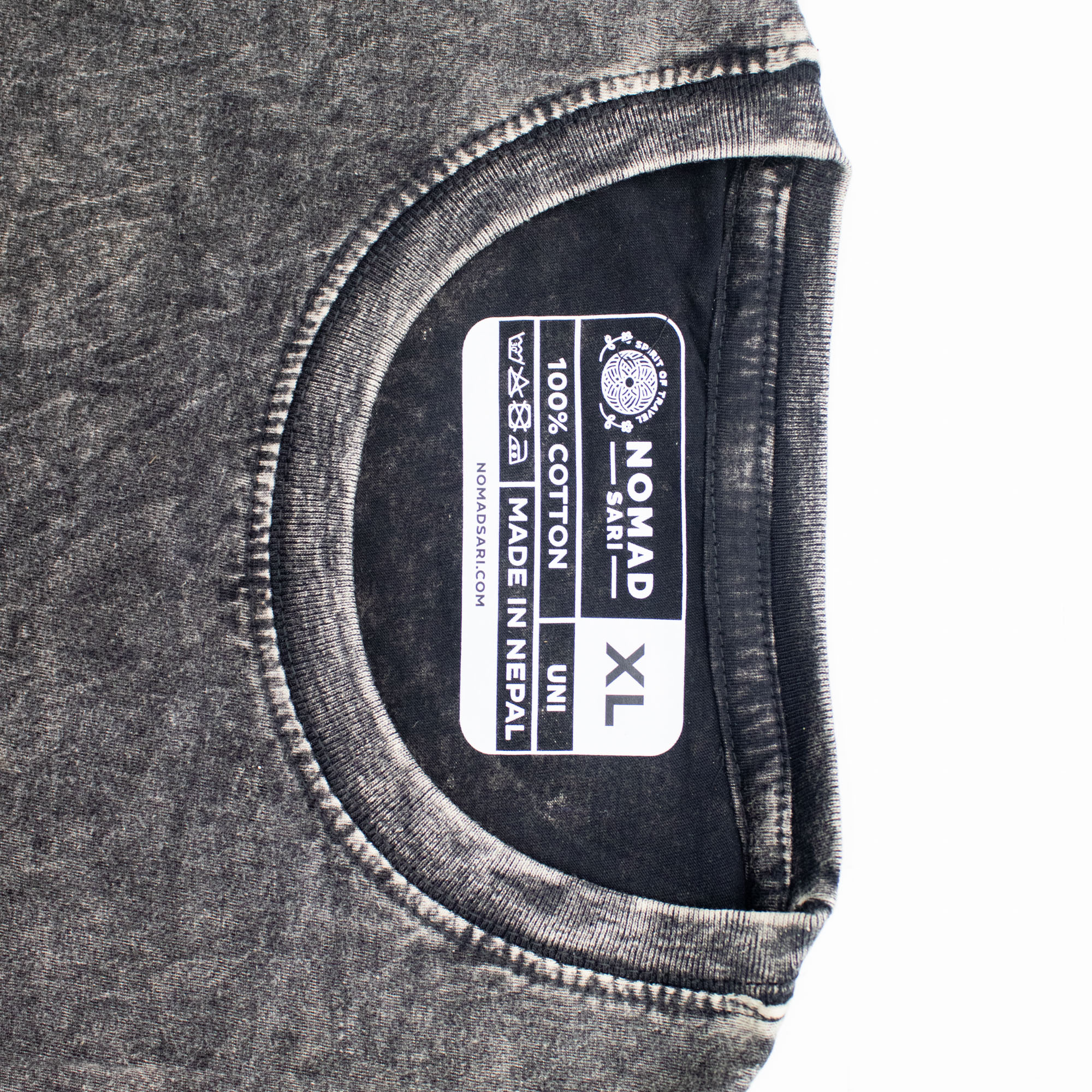 The XLarge Compass of Life T-shirt from Nomad Sari is an essential addition for retailers serving the adventure and lifestyle markets. The stone-washed charcoal fabric provides a unique, distressed texture that appeals to customers looking for high-quality, artisanal apparel.