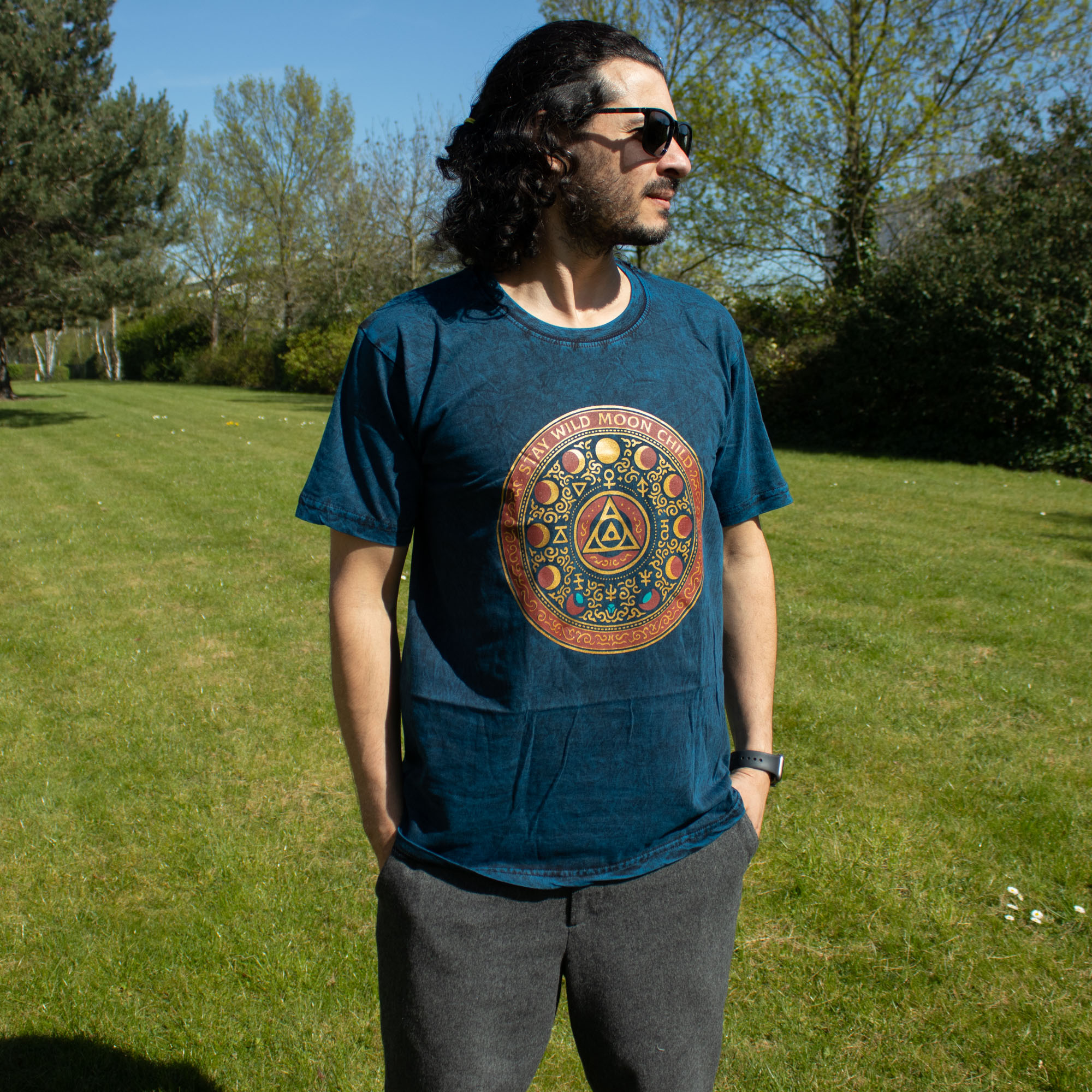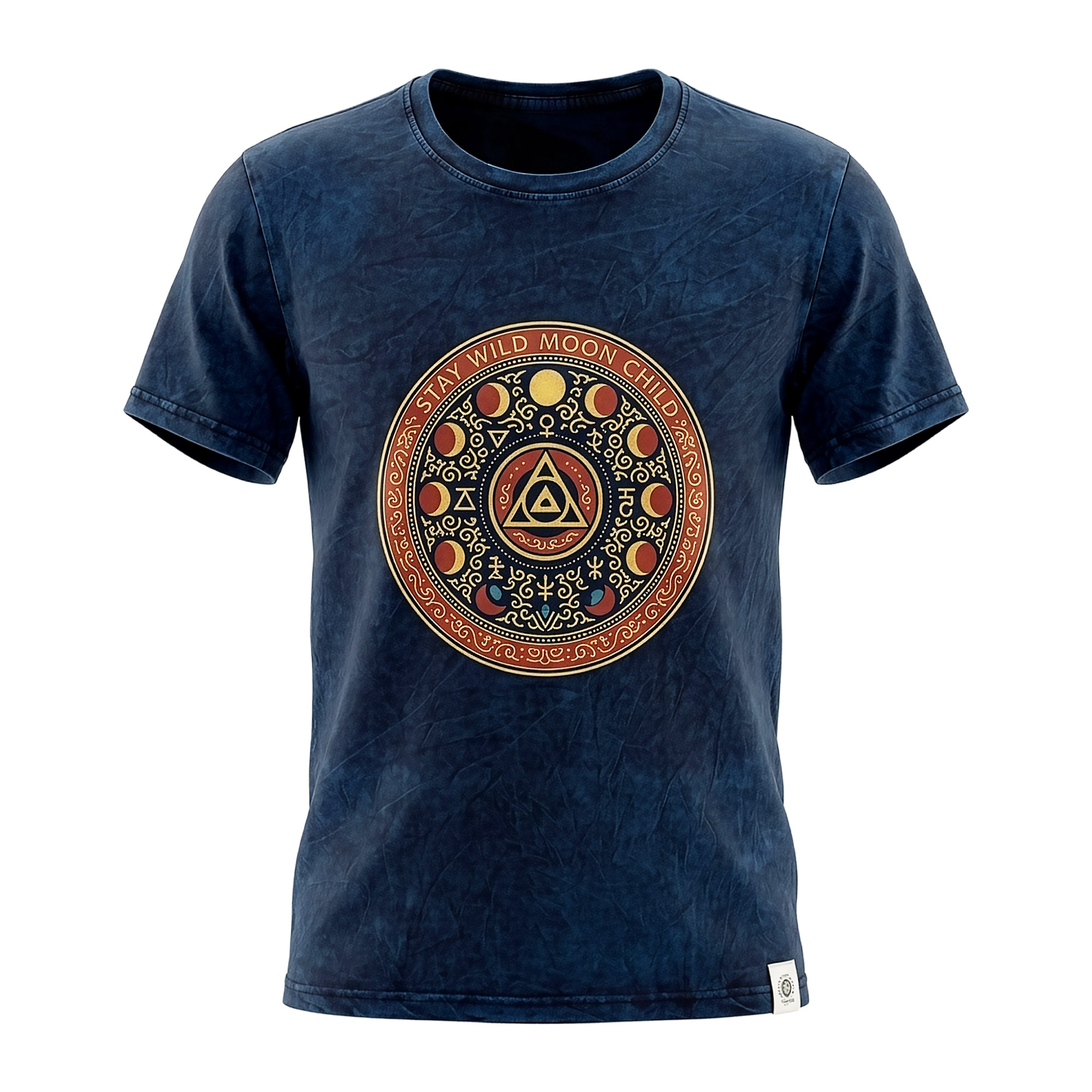 Broaden your boutique’s celestial collection with the Nomad Sari "Stay Wild Moon Child" T-shirt in Medium. This deep blue stone-washed tee features an intricate lunar mandala and alchemical symbols, blending a premium vintage texture with a mystical wanderlust spirit. It is a high-impact retail piece designed for modern travelers who value both symbolic art and rugged durability.