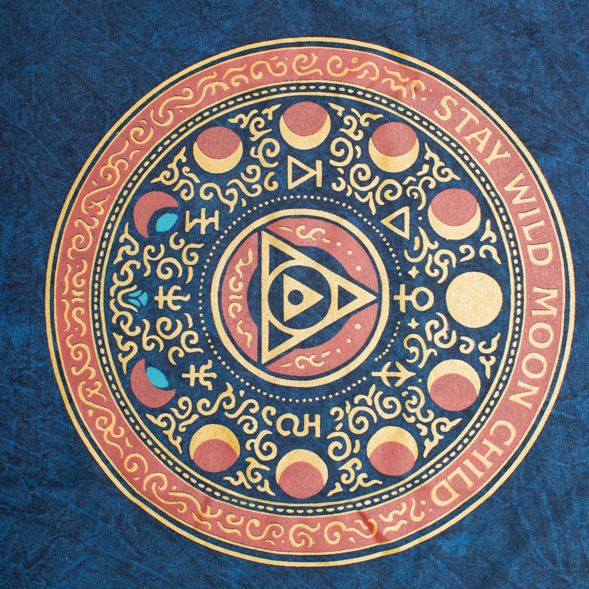 The Nomad Sari "Stay Wild Moon Child" T-shirt in Medium is a versatile staple for retailers catering to the bohemian and adventure markets. The fabric is treated with a specialised stone-wash technique, resulting in a rich, marbled blue finish that is exceptionally soft to the touch.