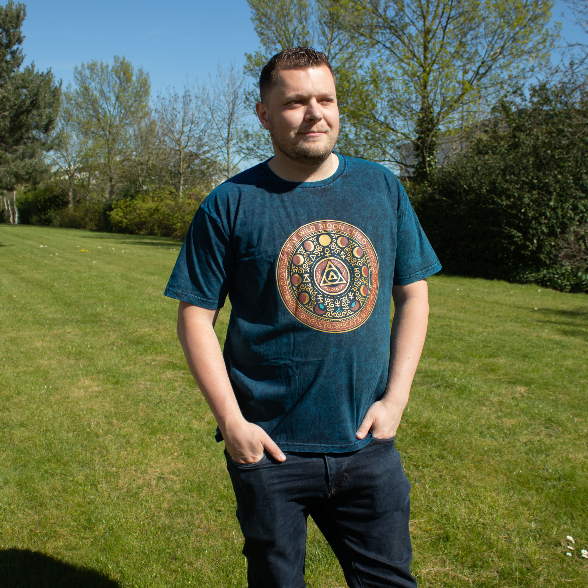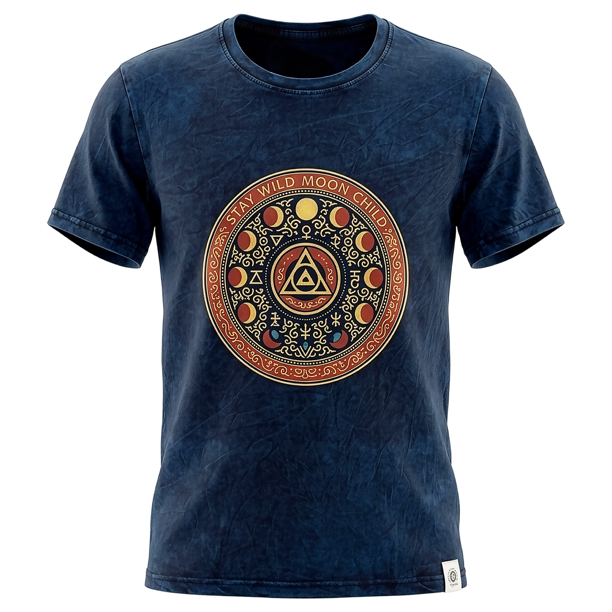 Maximise your inventory’s versatility with the Nomad Sari "Stay Wild Moon Child" T-shirt in XLarge. This deep blue stone-washed tee features a detailed cosmic mandala with lunar phases and alchemical symbols. Designed for the modern wanderer, it combines a premium vintage texture with a relaxed, comfortable fit, ensuring strong appeal for retailers targeting the bohemian and travel markets.