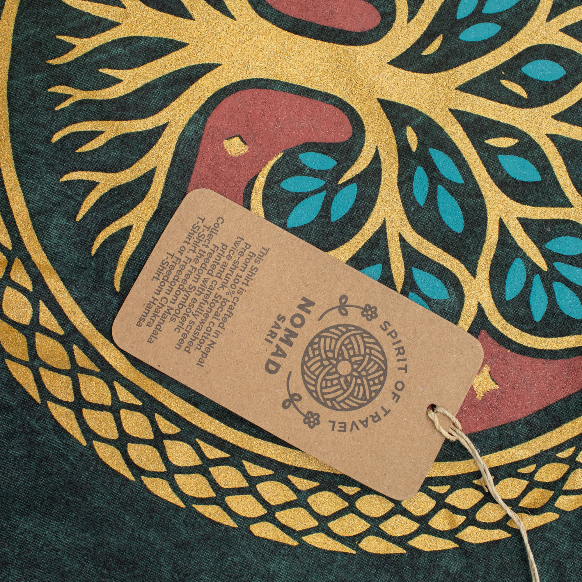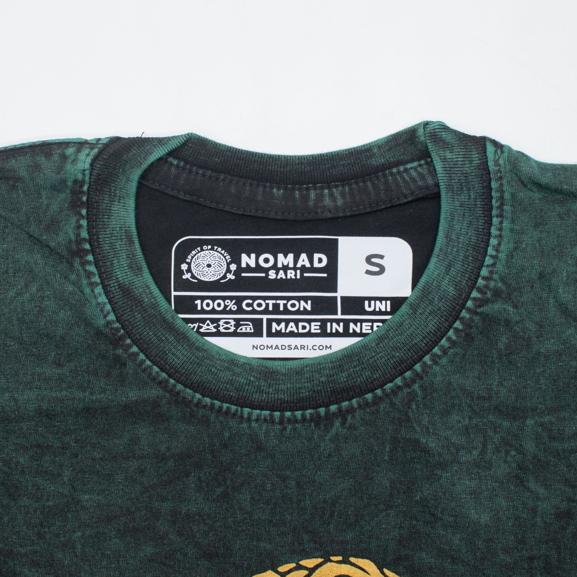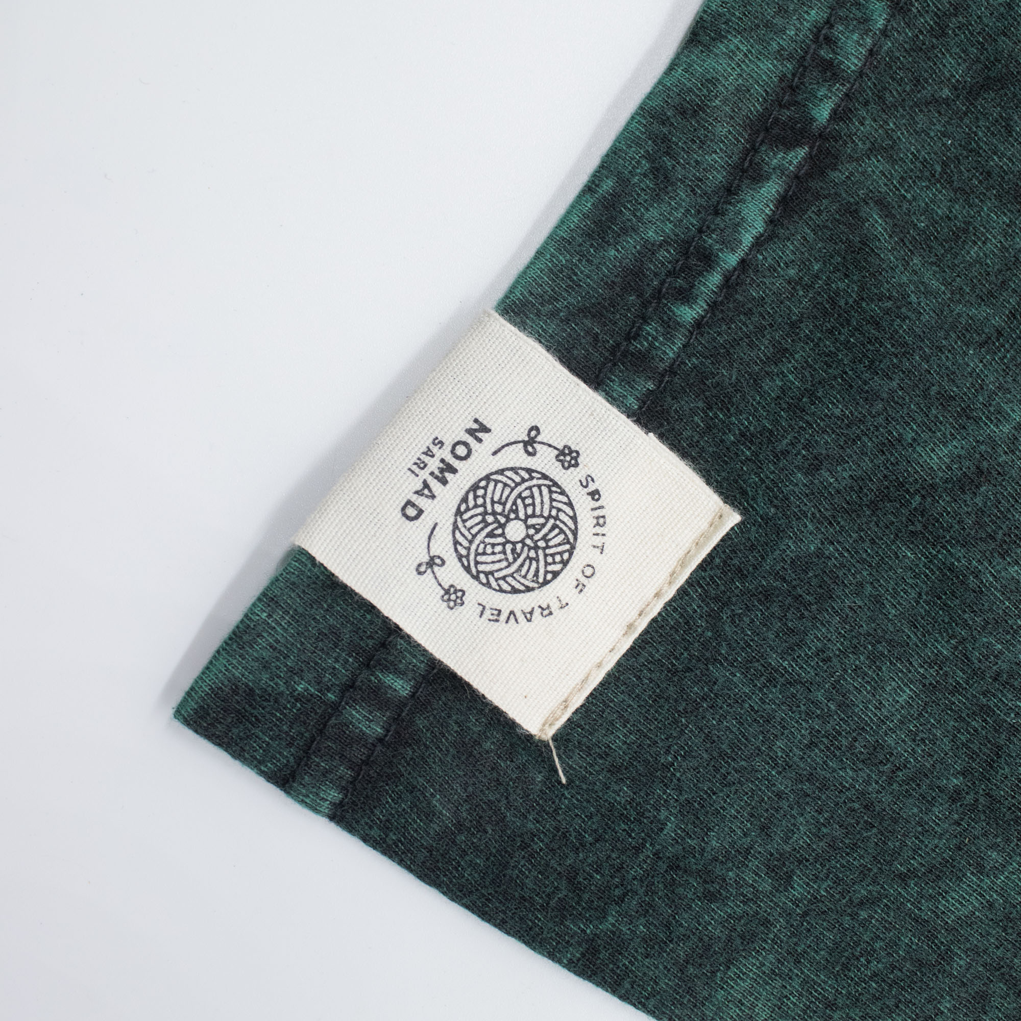 The Nomad Sari "Tree of Life" T-shirt is a striking choice for boutiques and lifestyle shops. The forest green fabric undergoes a specialised stone-washing process, creating a unique marbled texture and a soft, vintage hand-feel.