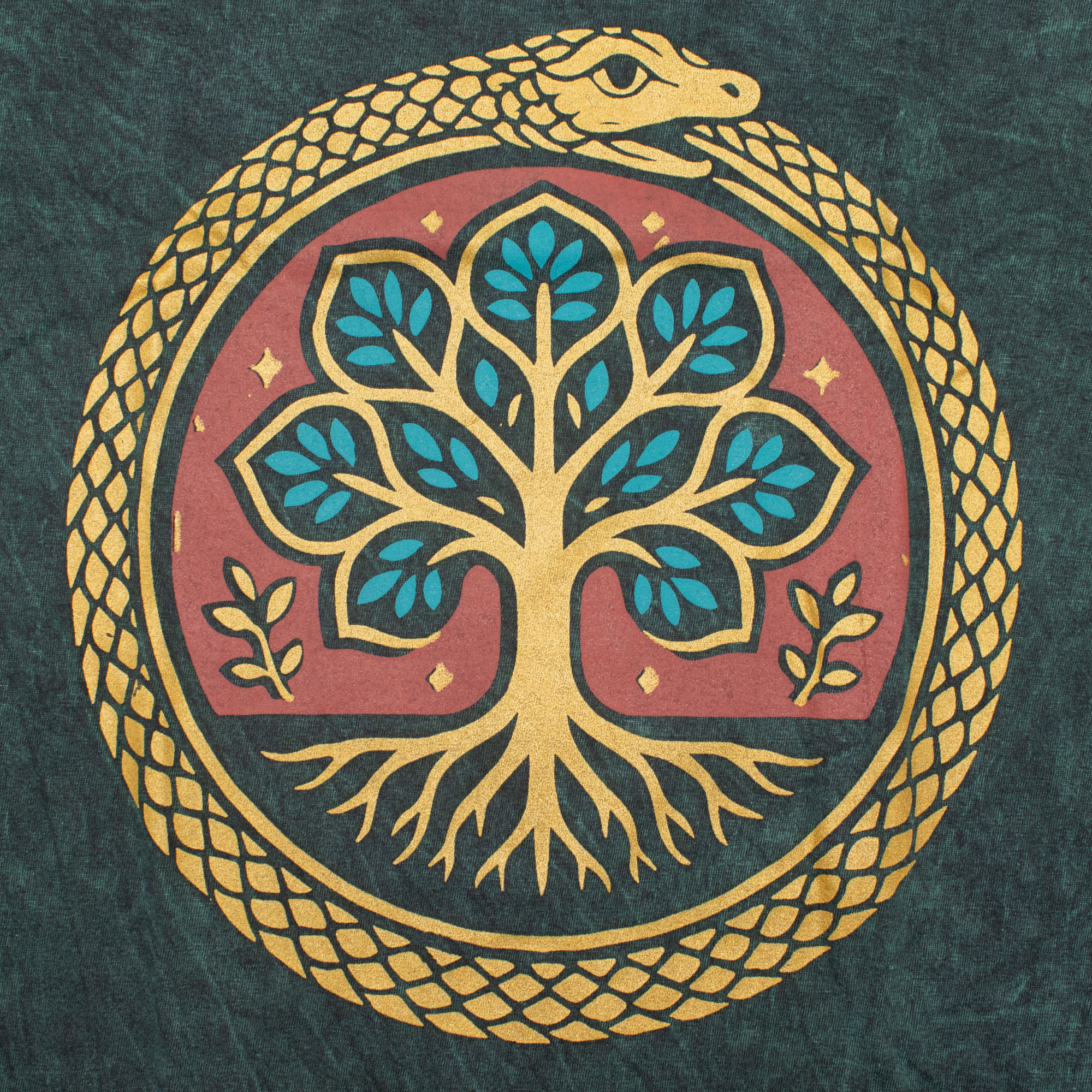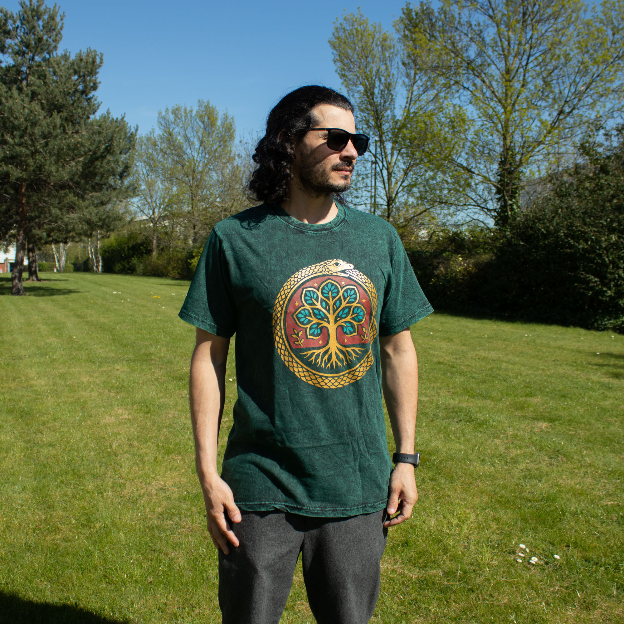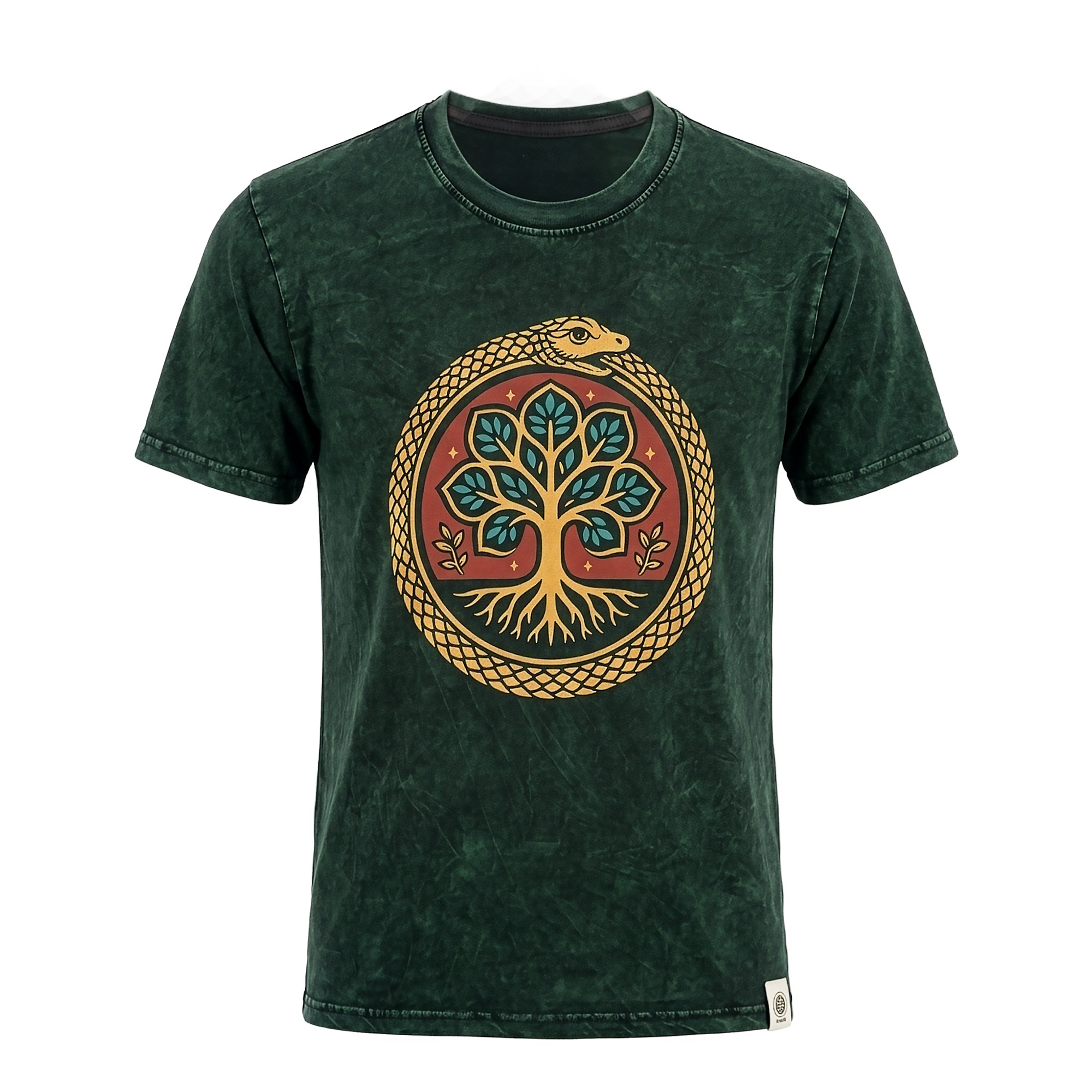Enrich your inventory with the Nomad Sari "Tree of Life" T-shirt in Small. This deep forest green stone-washed tee features a powerful Ouroboros snake encircling a vibrant Tree of Life design. Merging ancient symbolism with a rugged, lived-in aesthetic, it offers exceptional shelf appeal for retailers catering to the modern, eco-conscious wanderer.