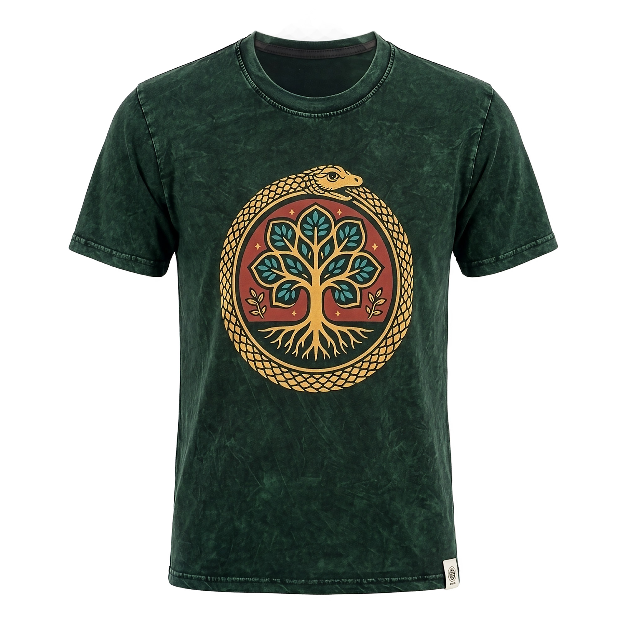 Promote a sense of grounded adventure with the Nomad Sari "Tree of Life" T-shirt in Medium. This forest green stone-washed tee features a golden Ouroboros encircling a rooted Tree of Life, blending ancient mysticism with a rugged, lived-in aesthetic. It is a premium retail staple for modern travelers, offering a high-end vintage feel and significant shelf appeal.