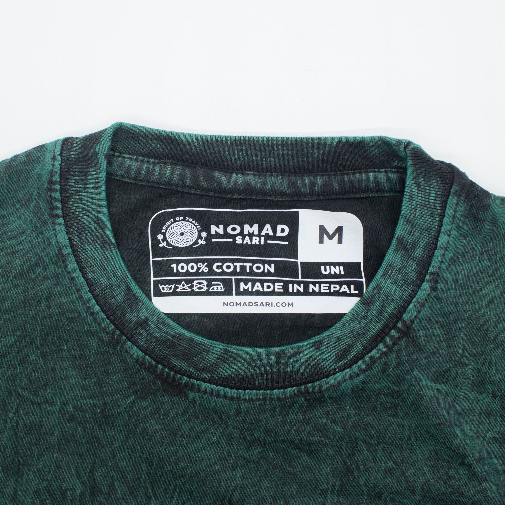 The Nomad Sari Tree of Life T-shirt is a versatile asset for retailers catering to the bohemian and eco-conscious markets. The medium-sized garment is crafted from heavy-duty cotton that has been stone-washed to achieve a rich, marbled green texture and an exceptionally soft finish.