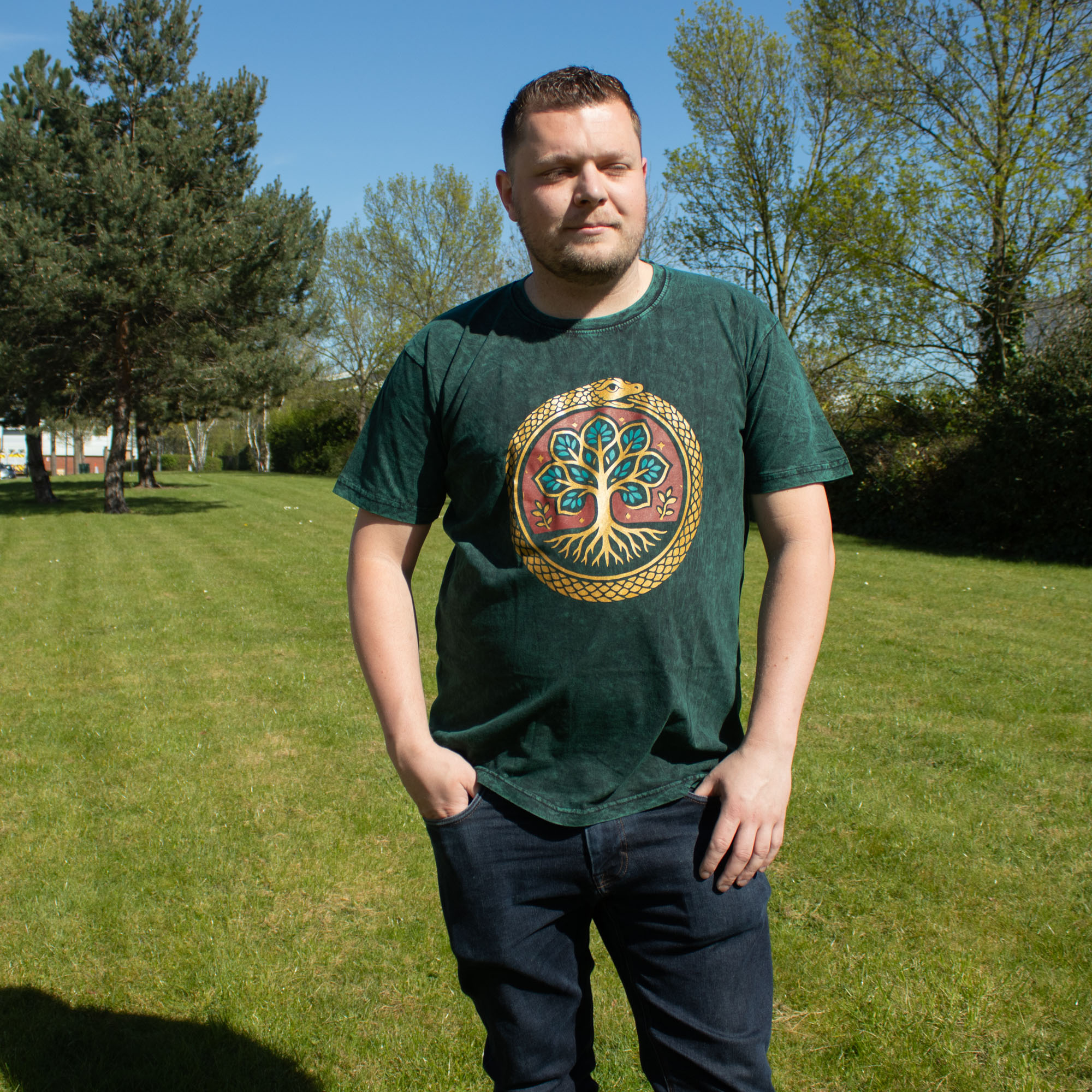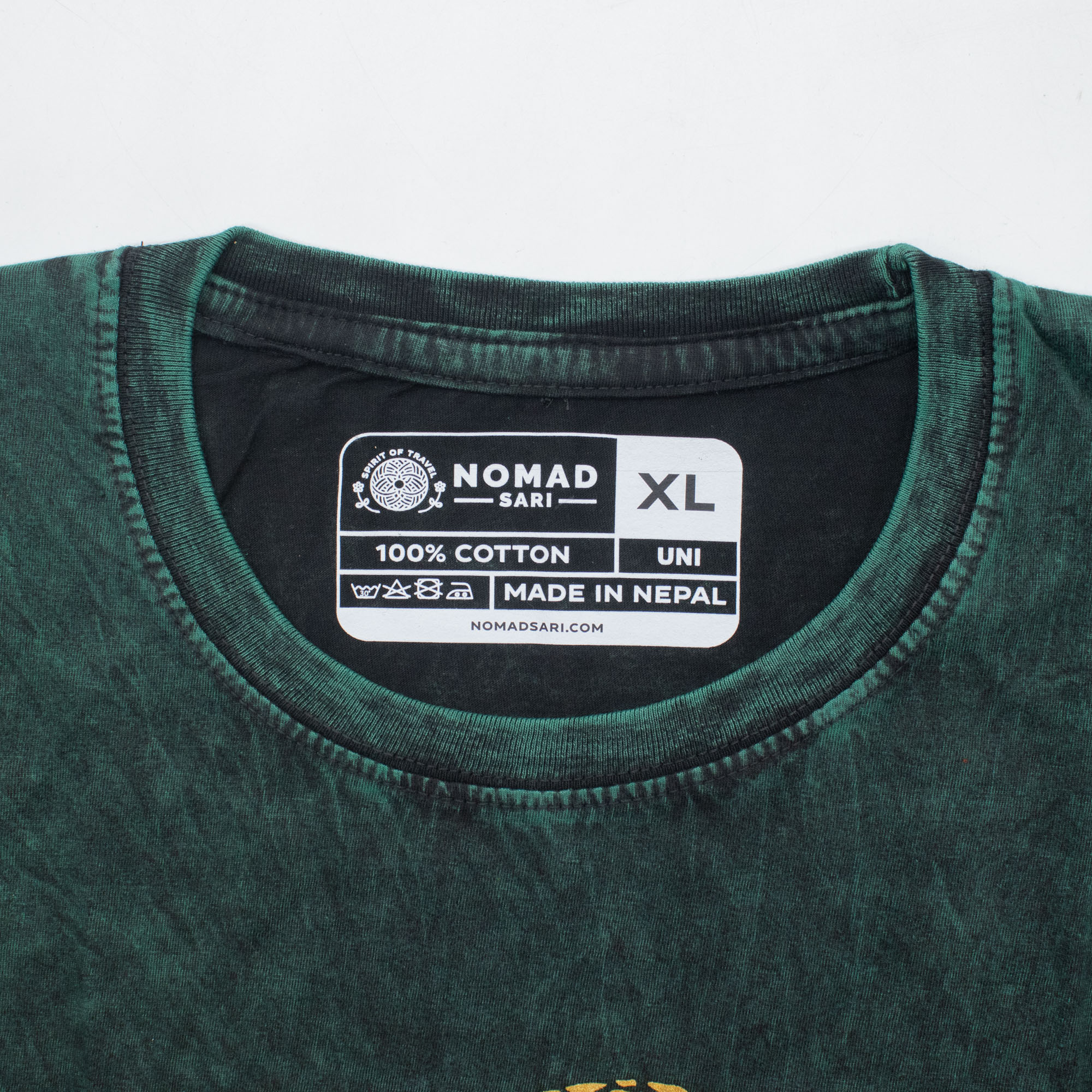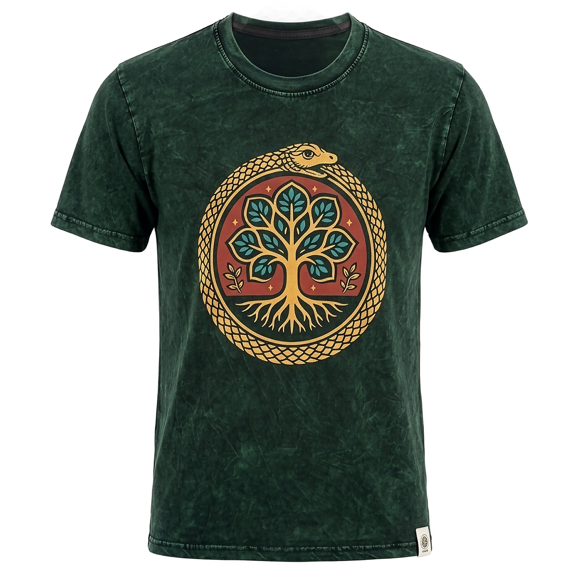 Maximise your store's appeal with the Nomad Sari "Tree of Life" T-shirt in XLarge. This forest green stone-washed tee features a golden Ouroboros encircling a rooted Tree of Life, merging ancient symbolism with a rugged, lived-in aesthetic. Built for the modern wanderer, it offers a premium, relaxed fit and a soft vintage feel that stands out in any travel-focused retail collection.