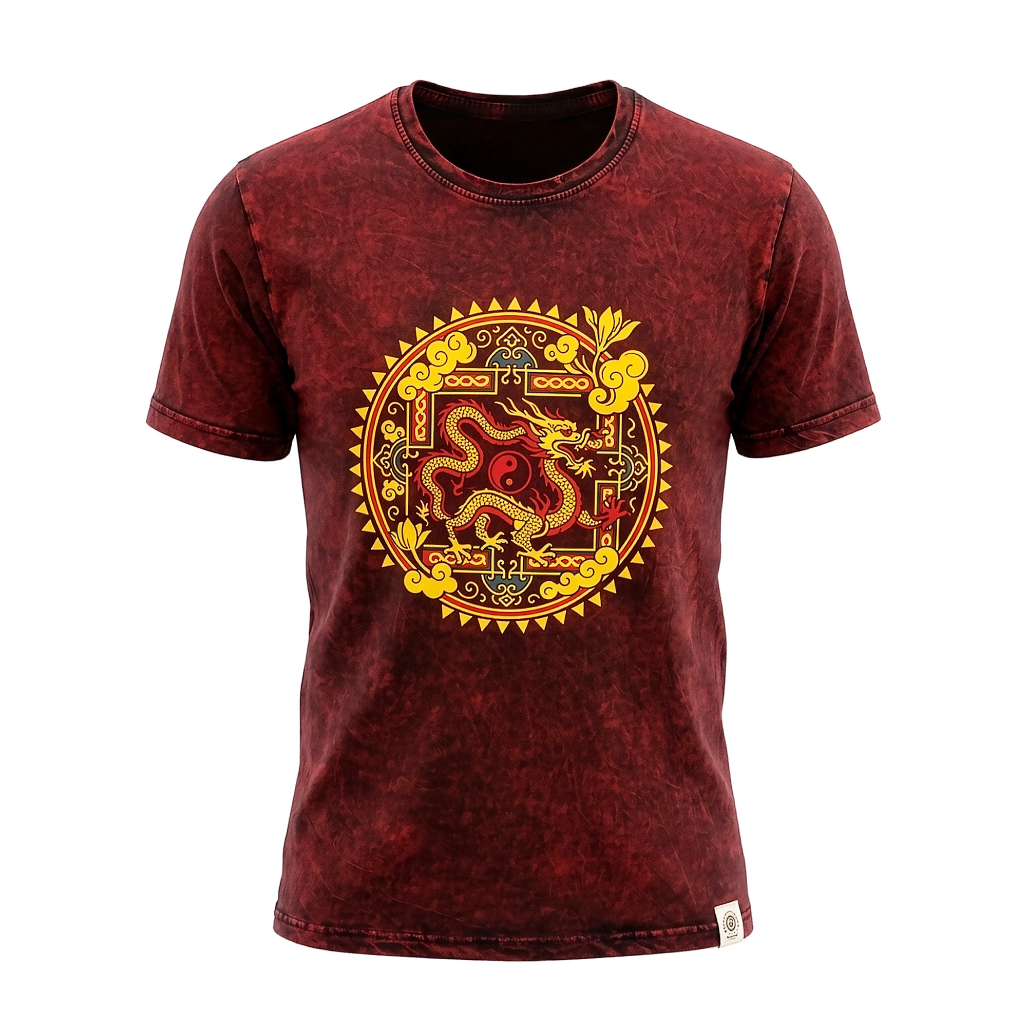 Infuse your retail collection with power and balance with the Nomad Sari "Dragon Mandala" T-shirt in Small. This maroon stone-washed tee features a striking golden dragon encircling a Yin Yang symbol within an intricate mandala. Designed for the modern wanderer, it offers a premium vintage texture and a bold Eastern aesthetic that guarantees immediate shelf appeal.