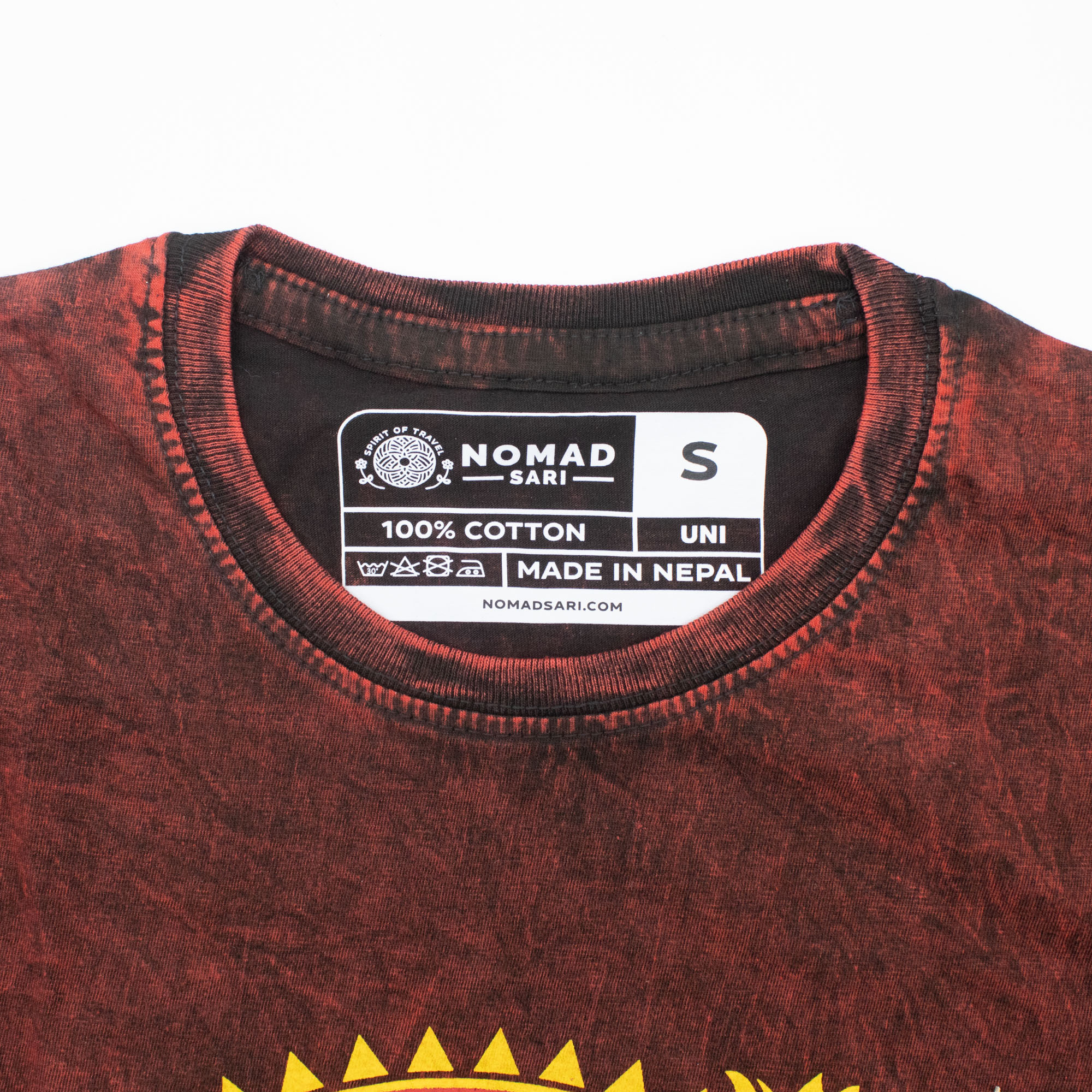 The Nomad Sari Dragon Mandala T-shirt is an essential item for boutiques and lifestyle stores catering to the wanderlust and spiritual community. The deep maroon fabric is treated with a specialised stone-wash process, resulting in a unique, marbled finish and an exceptionally soft, lived-in feel.