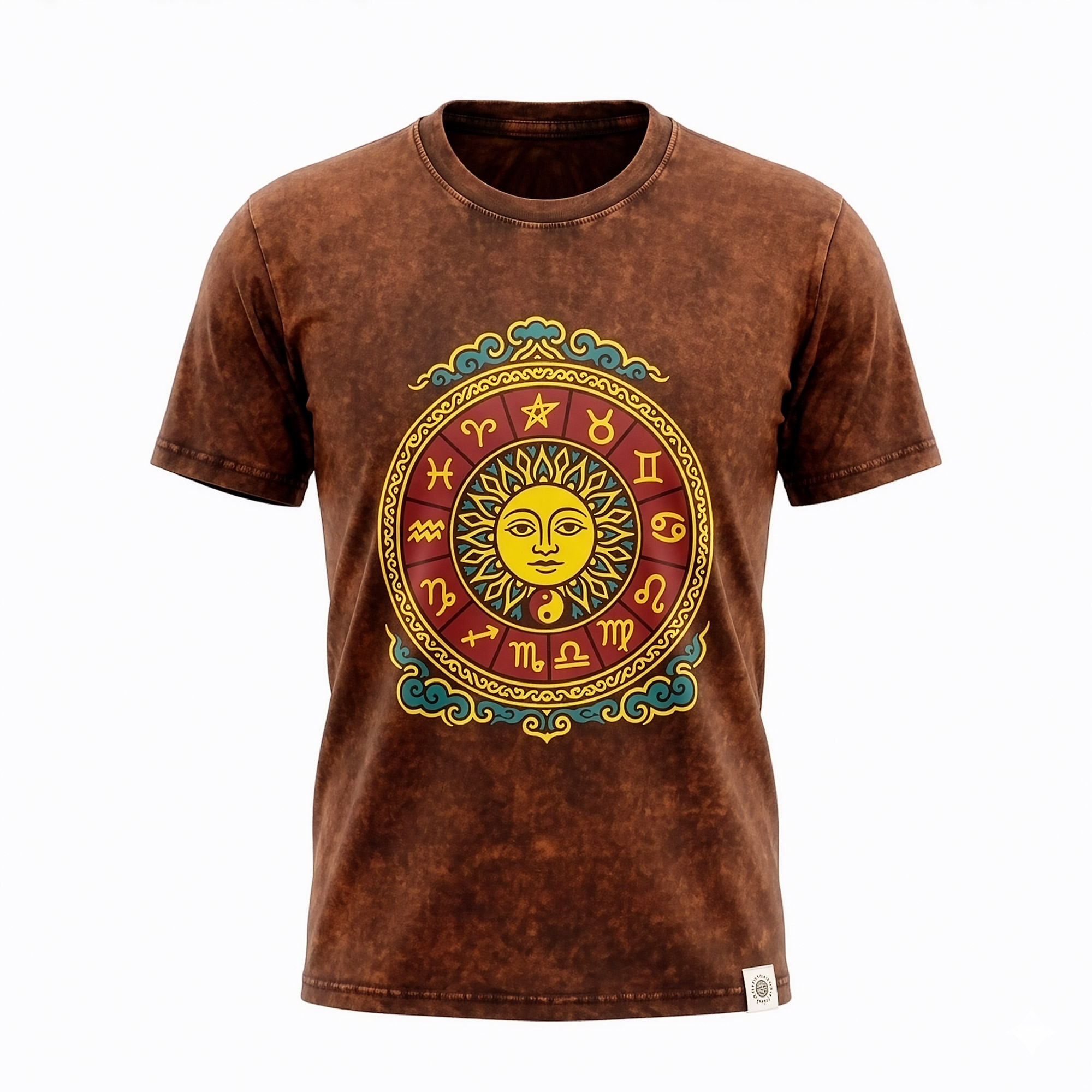 Enhance your retail inventory with the Nomad Sari "Sun & Zodiac" T-shirt in Small. This warm brown stone-washed tee features a striking celestial sun mandala encircled by zodiac symbols and a Yin Yang. Built for the modern traveler, it offers a premium vintage texture and a mystical aesthetic that ensures immediate shelf appeal for your boutique.