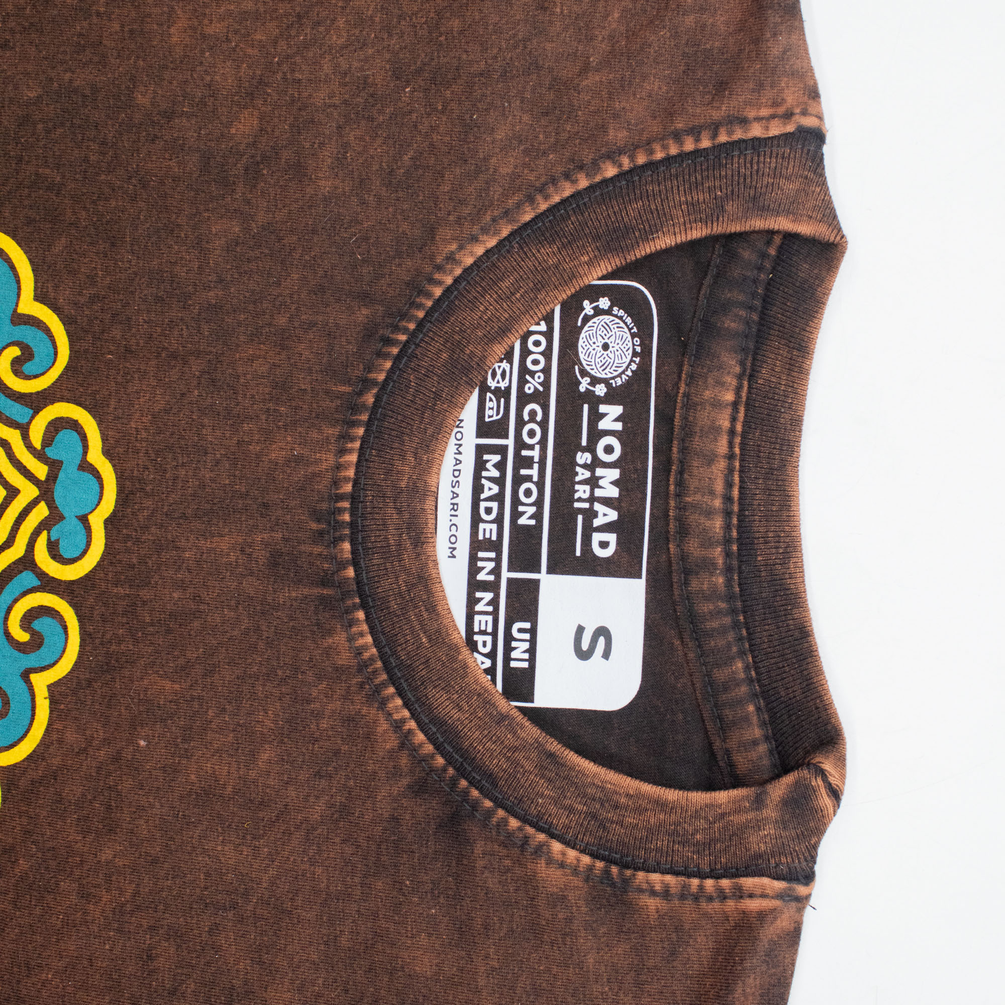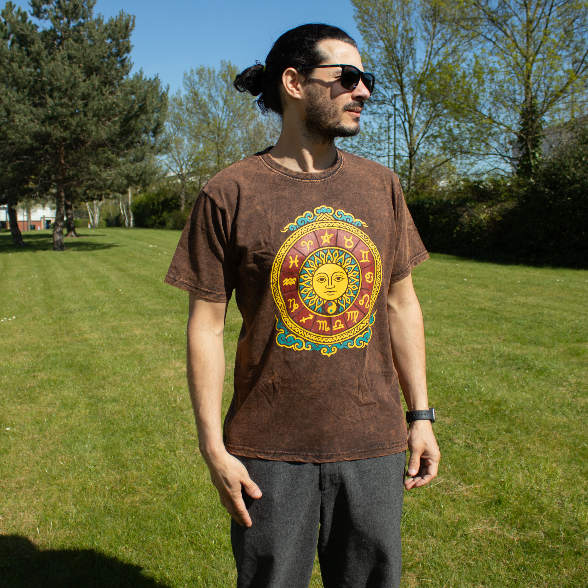 The Nomad Sari Sun & Zodiac T-shirt is a must-have for lifestyle retailers and boutiques catering to the bohemian and astrology-minded community. The deep earth-brown fabric is treated with a specialised stone-wash process, creating a unique, marbled finish and a soft, lived-in feel.