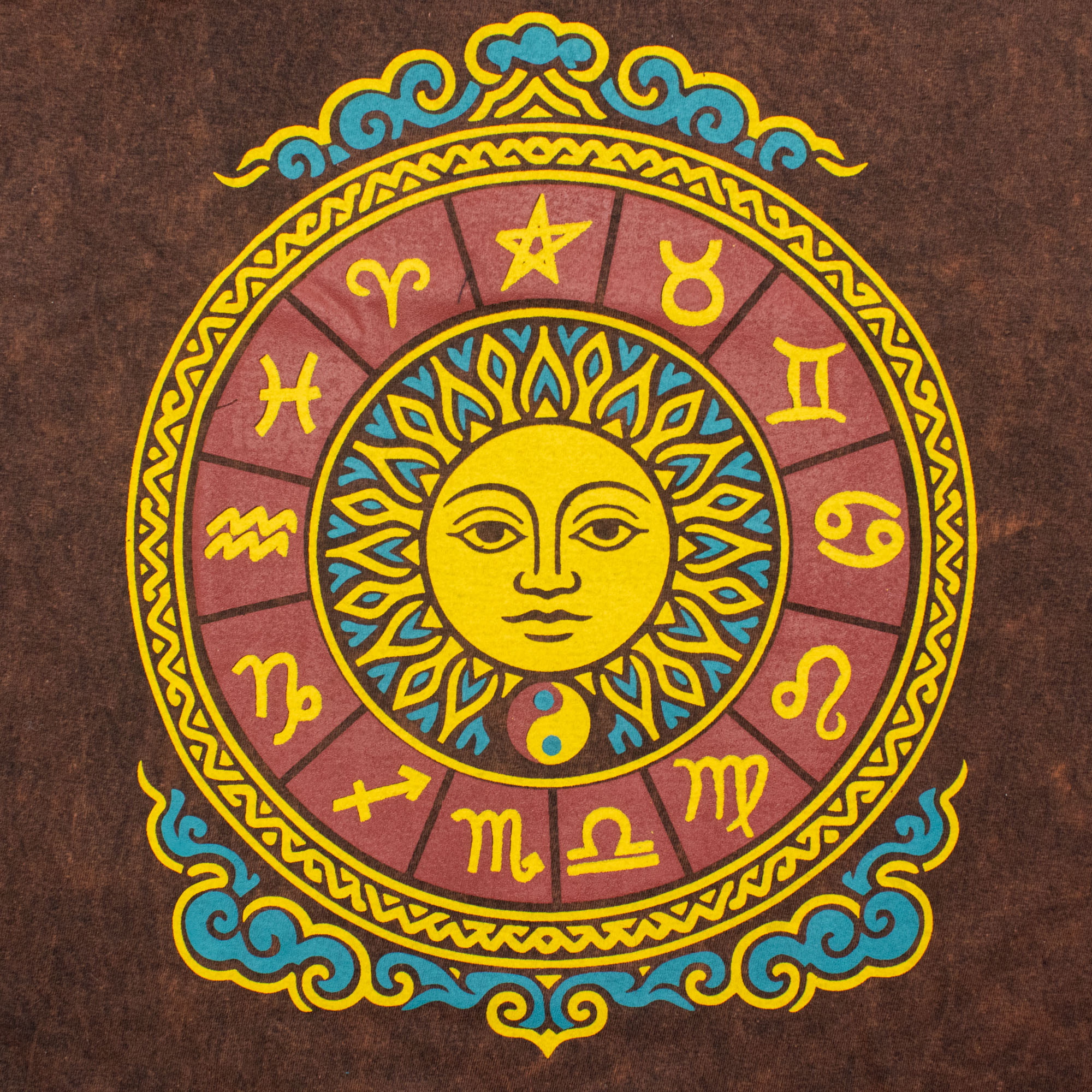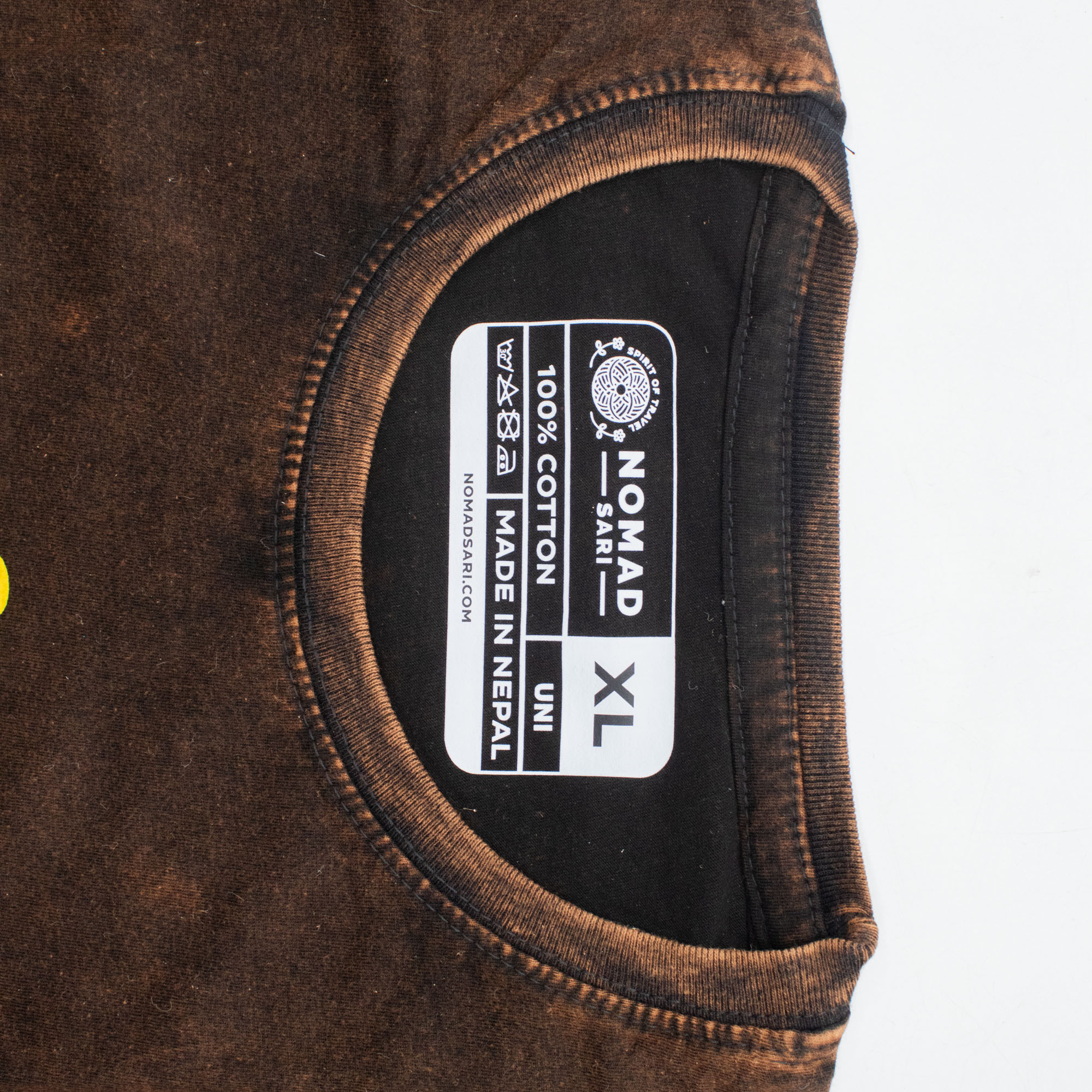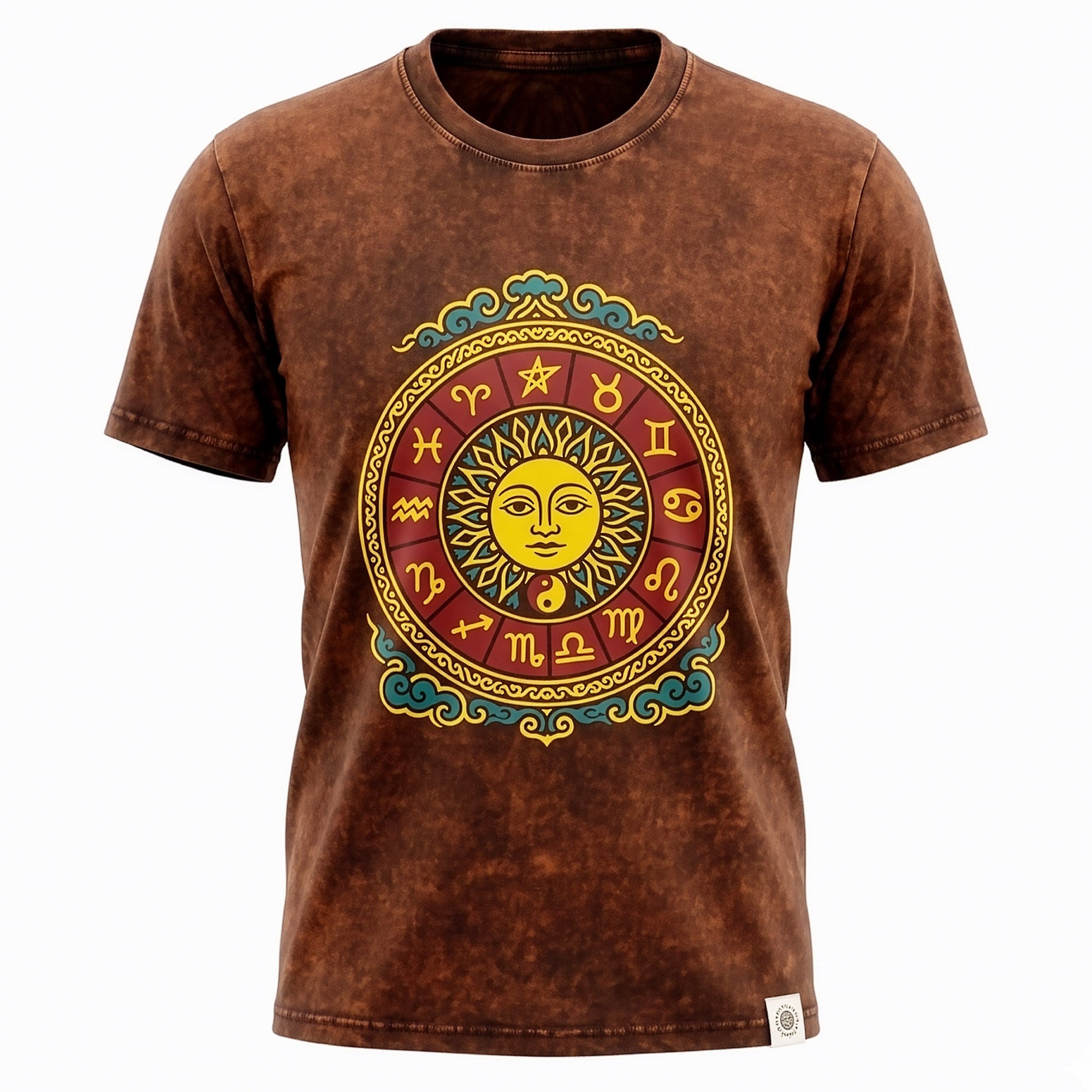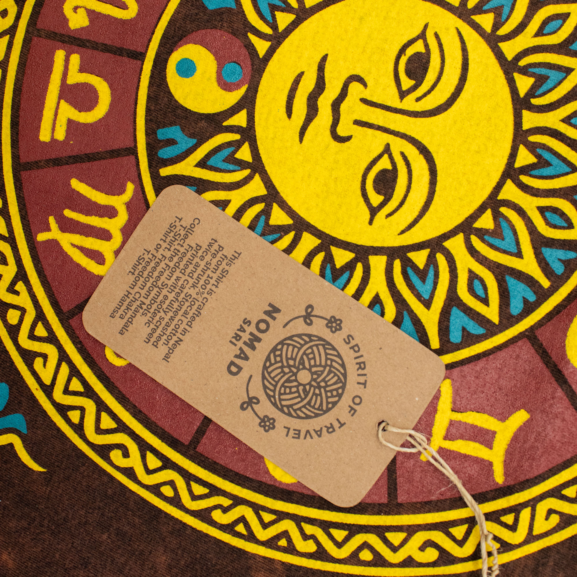 Command attention in your retail space with the Nomad Sari "Sun & Zodiac" T-shirt in XLarge. This warm brown stone-washed tee features a majestic celestial mandala, zodiac symbols, and a central Yin Yang. Designed for the modern wanderer, it combines a premium vintage texture with a relaxed, roomy fit, ensuring strong appeal for shops catering to the bohemian and travel markets.