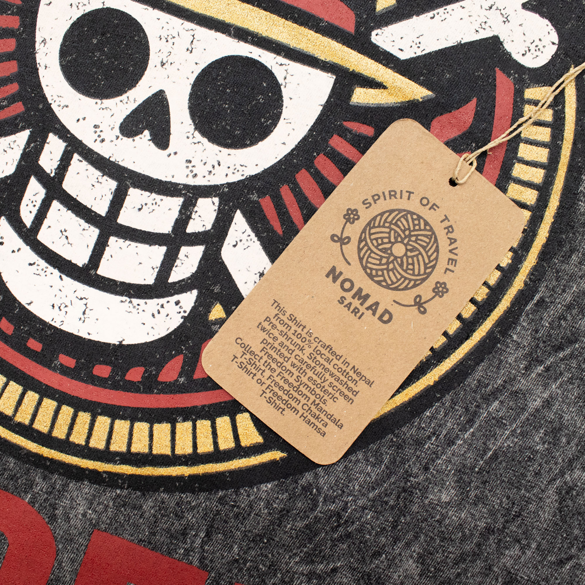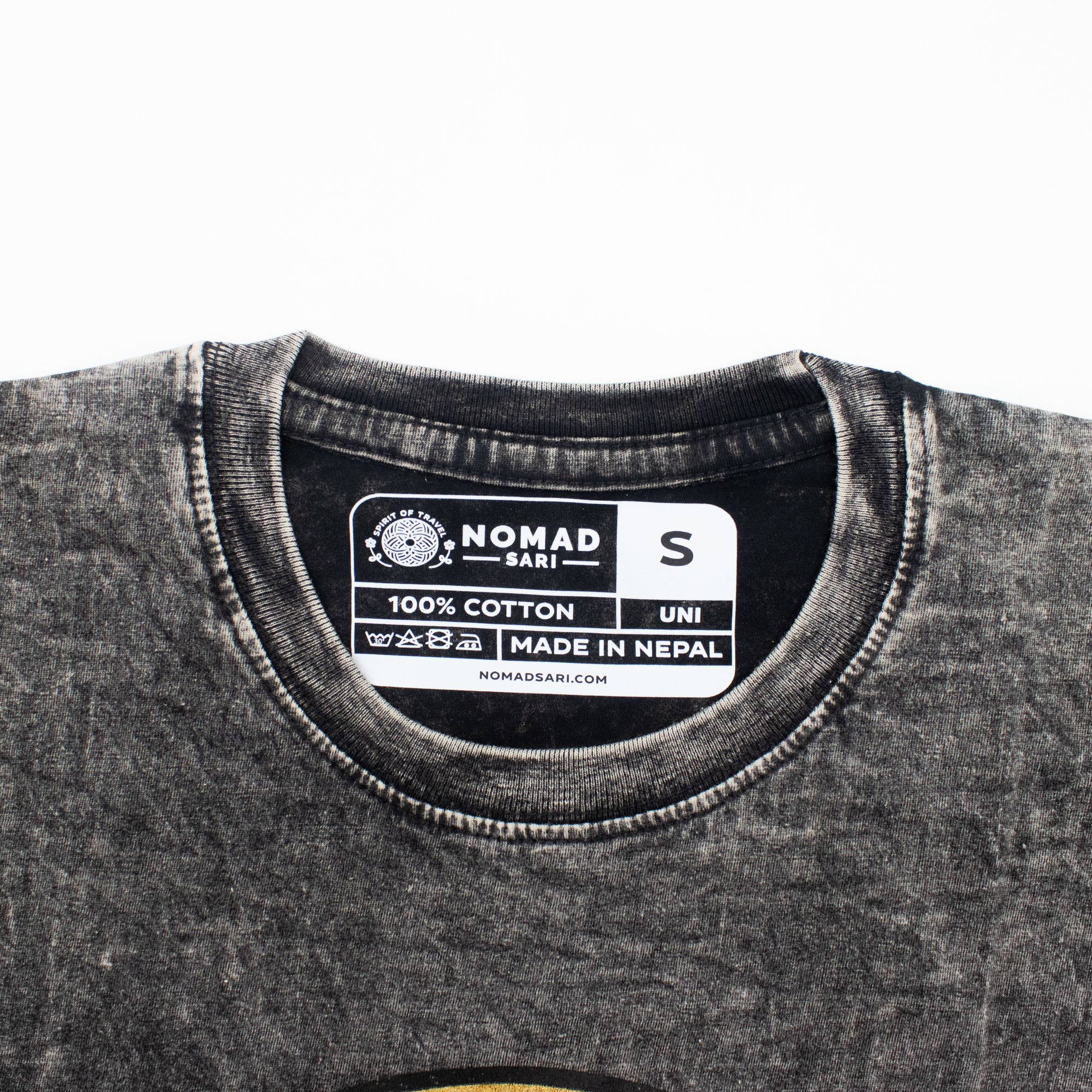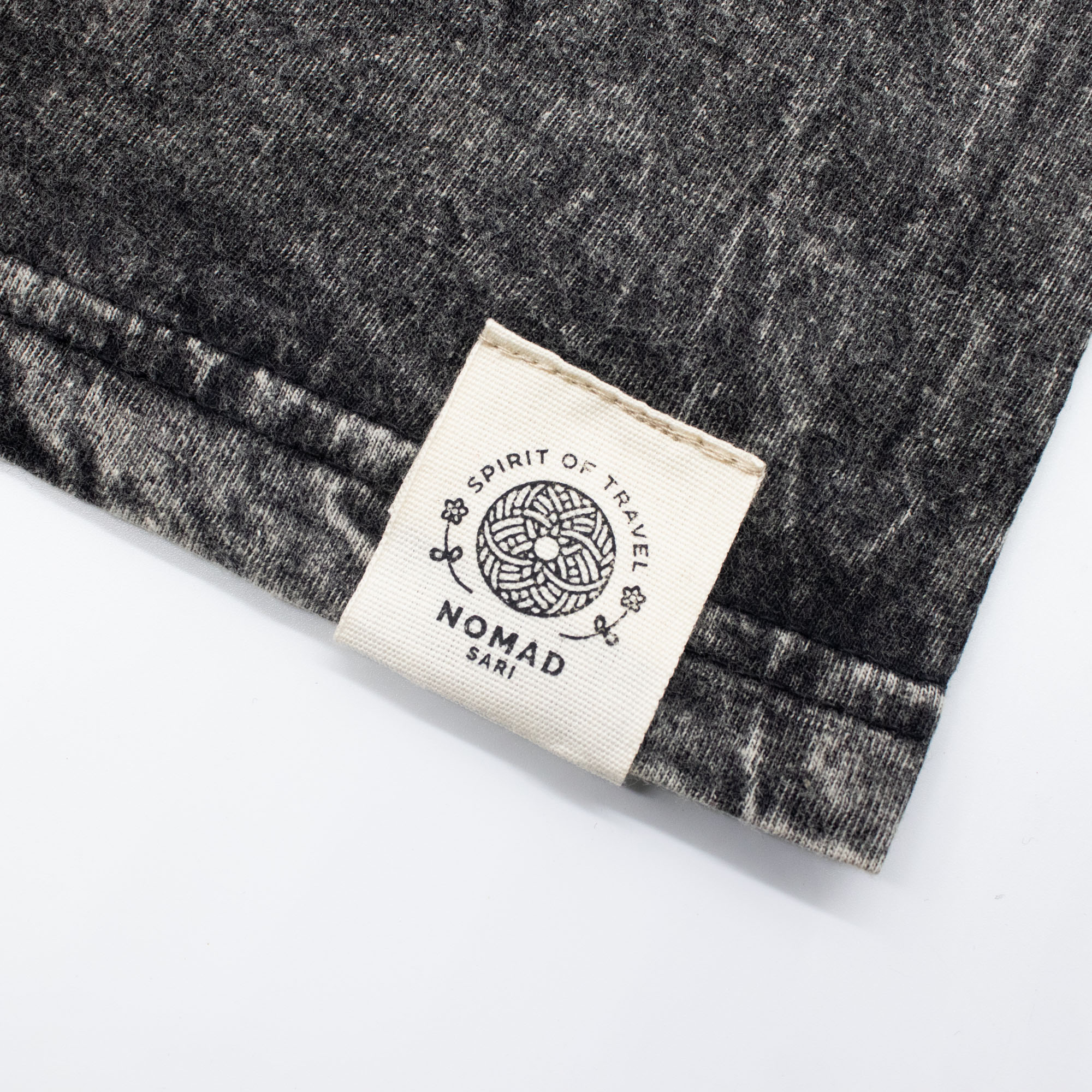 The Nomad Sari "Rebel" T-shirt is a striking choice for lifestyle shops and boutiques catering to the bold and adventurous. The charcoal fabric undergoes a specialised stone-wash process, creating a high-contrast, marbled texture and a soft, lived-in feel.