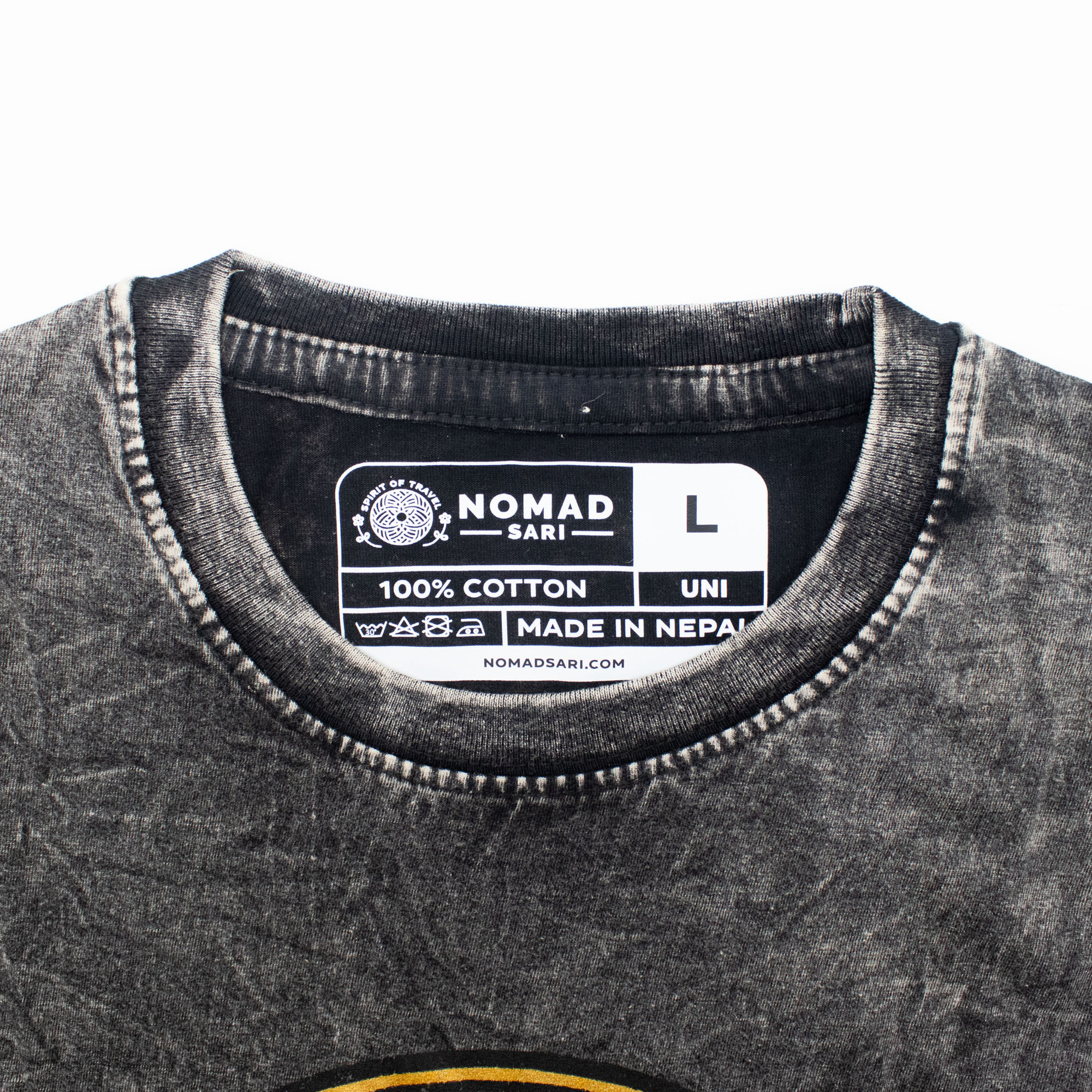 The Nomad Sari "Rebel" T-shirt in Large is a standout addition to any retail inventory focused on edgy, travel-inspired fashion. The Large size offers a relaxed, comfortable fit that is highly sought after by customers prioritising mobility and ease during their travels. The charcoal fabric is stone-washed to achieve a unique, marbled character and a soft, lived-in feel.