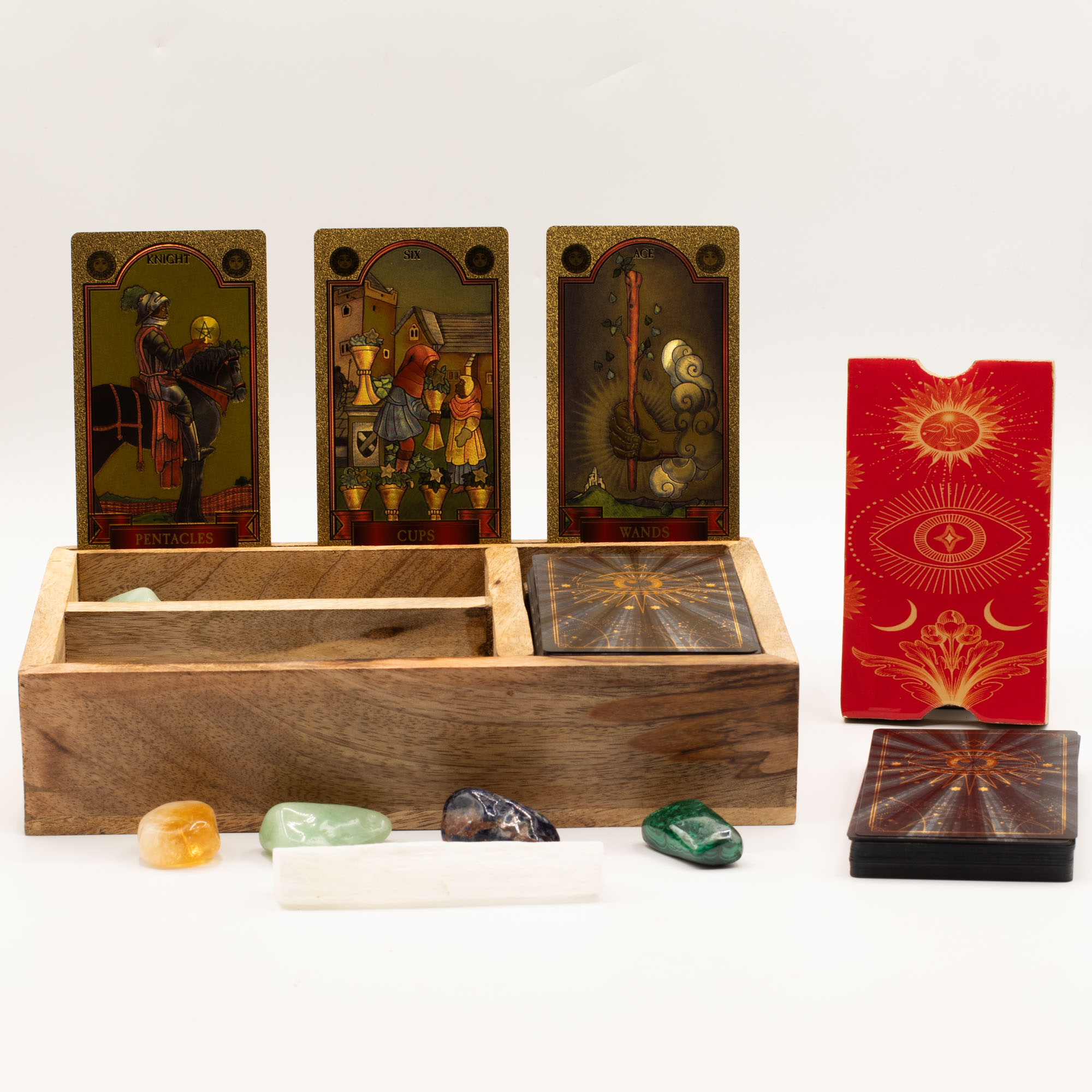 Designed for readers who use multiple tools in their practice, this mango wood box features several compartments for tarot cards, crystals, pendulums, smudge sticks, and ritual accessories. The built-in card display turns readings into a visual experience, making this box ideal for more expansive or ceremonial setups.