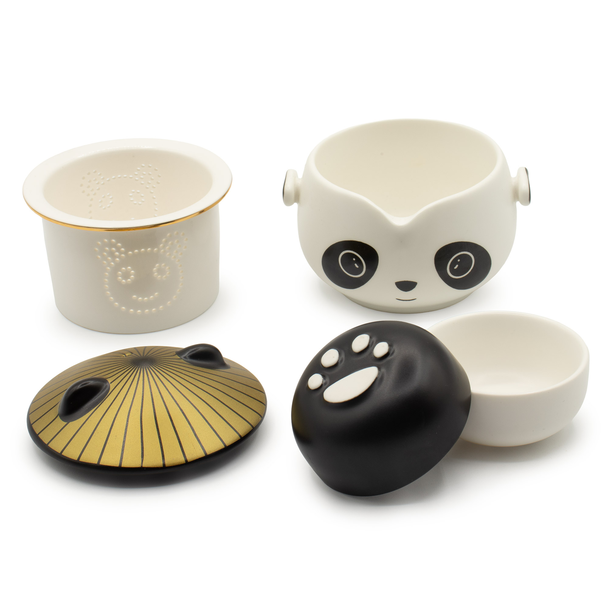 The teapot features an adorable panda face, complete with expressive eyes and a friendly smile. The lid is designed to resemble a traditional Chinese hat in golden color, adding a touch of cultural charm. The teapot handles are adorned with cute panda paw prints, enhancing the playful design, The teapot includes a removable stainless steel infuser, making it easy to brew loose leaf teas and clean afterward.