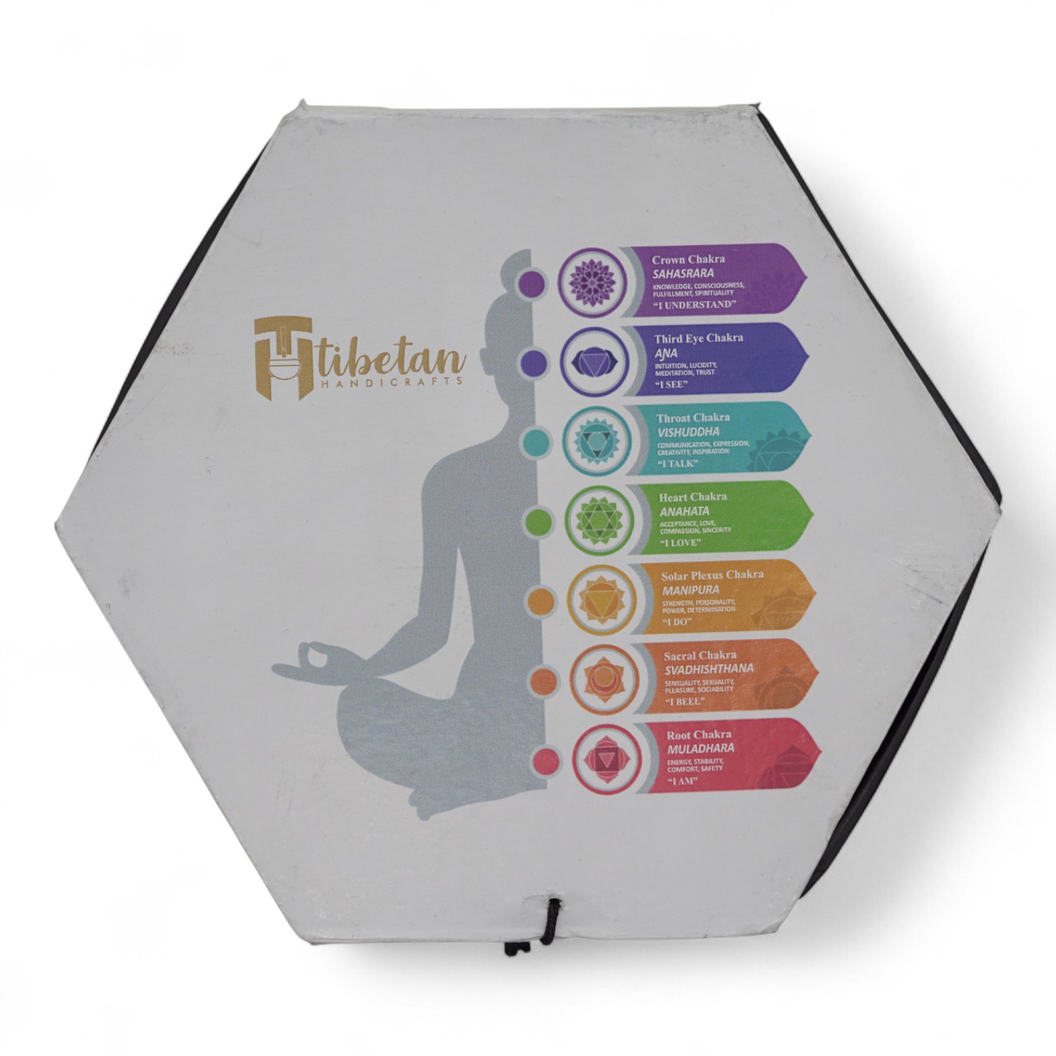 Small set with cushion, wooden stick and singing bowl, decorated with moon phases. Packed into the pouch and hexagonal box.