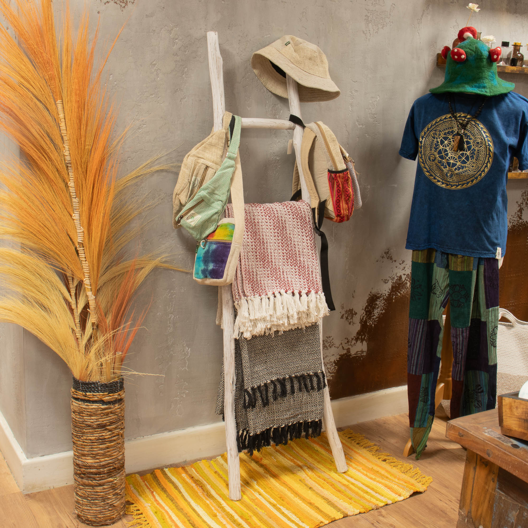 Made from Kemu wood, each ladder features natural wood shaping that adds character while remaining lightweight and easy to position in-store or in window displays. The vertical design helps retailers display textiles neatly while saving valuable floor space.