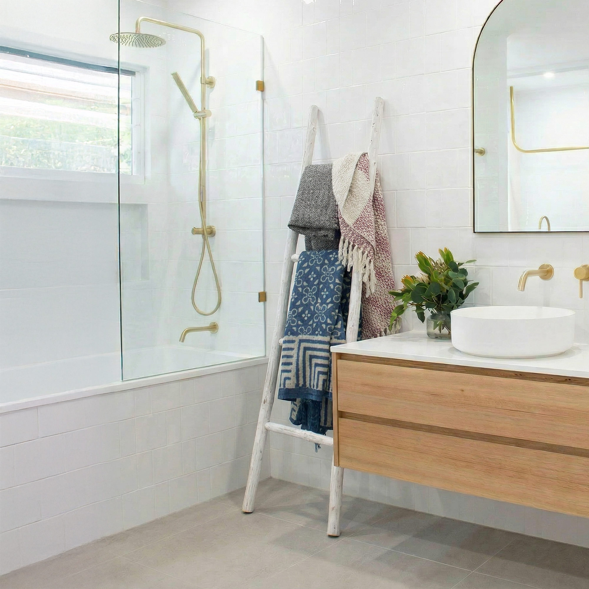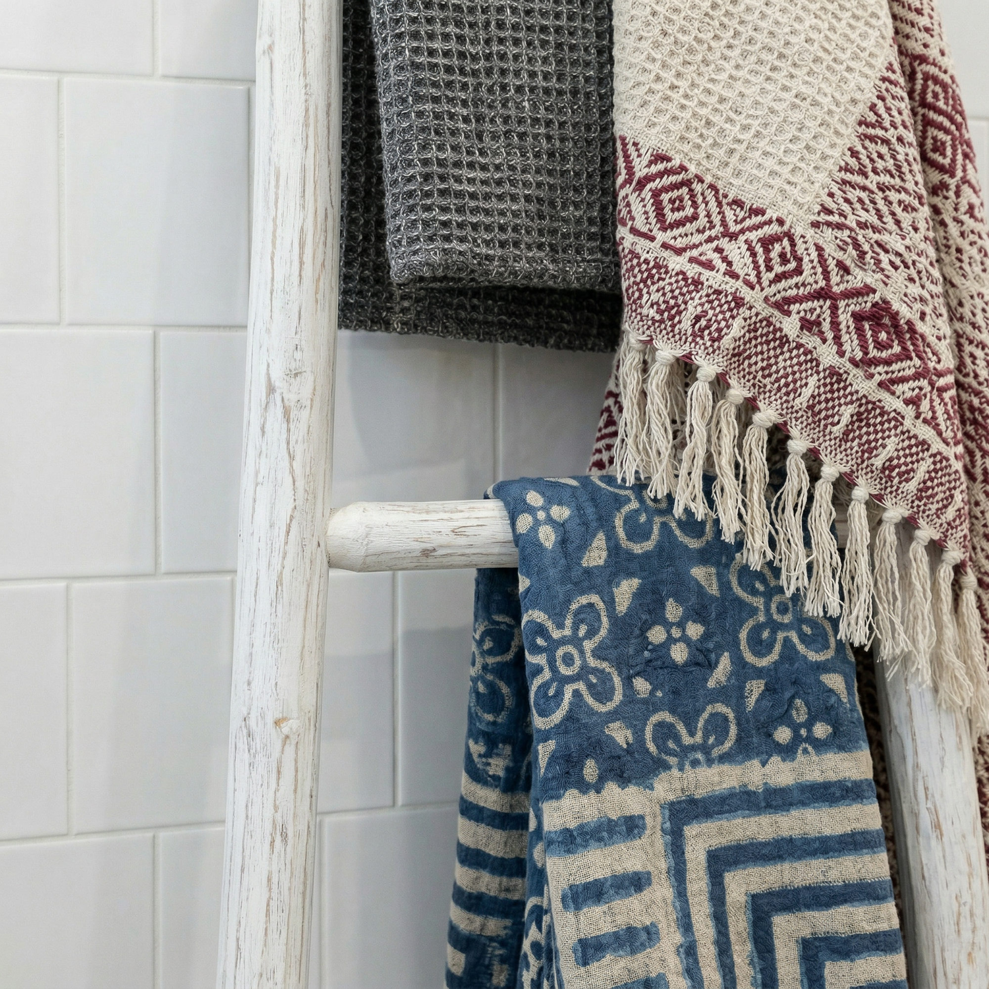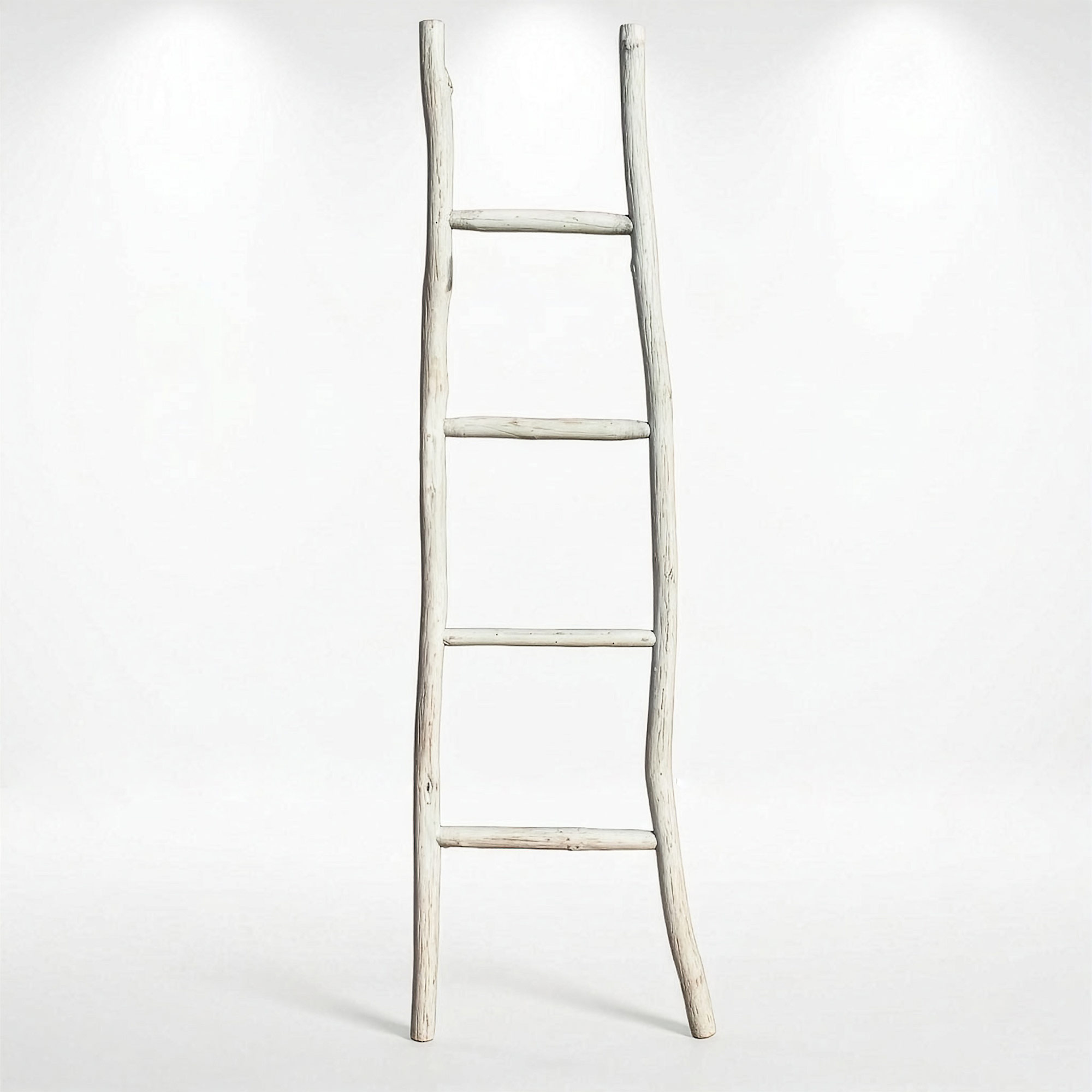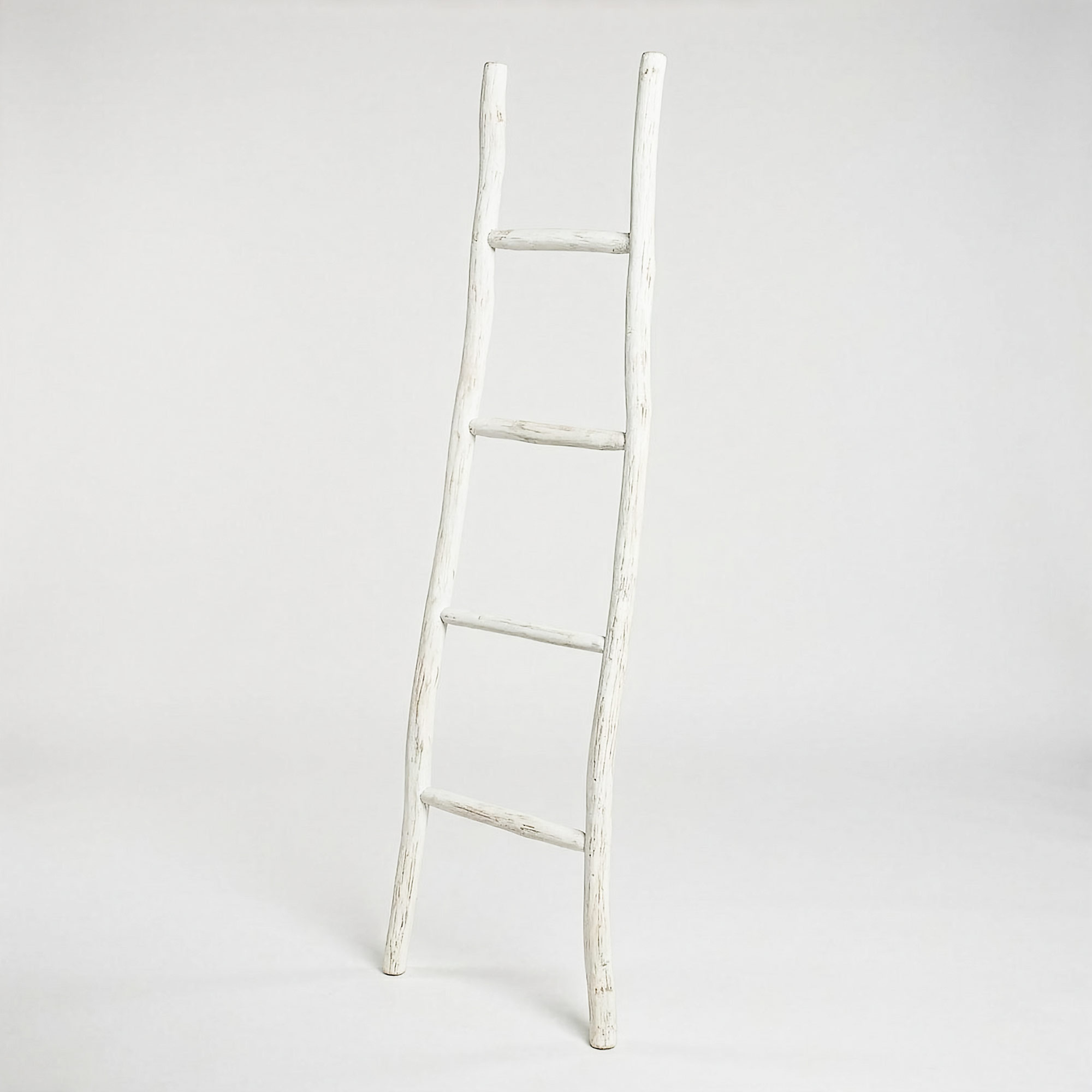 A decorative 1.5 m ladder display designed for showcasing throws, blankets, towels or scarves in retail spaces. The soft whitewash finish paired with a clean Japan-style design creates a light, relaxed display piece ideal for homeware, gift and lifestyle stores.