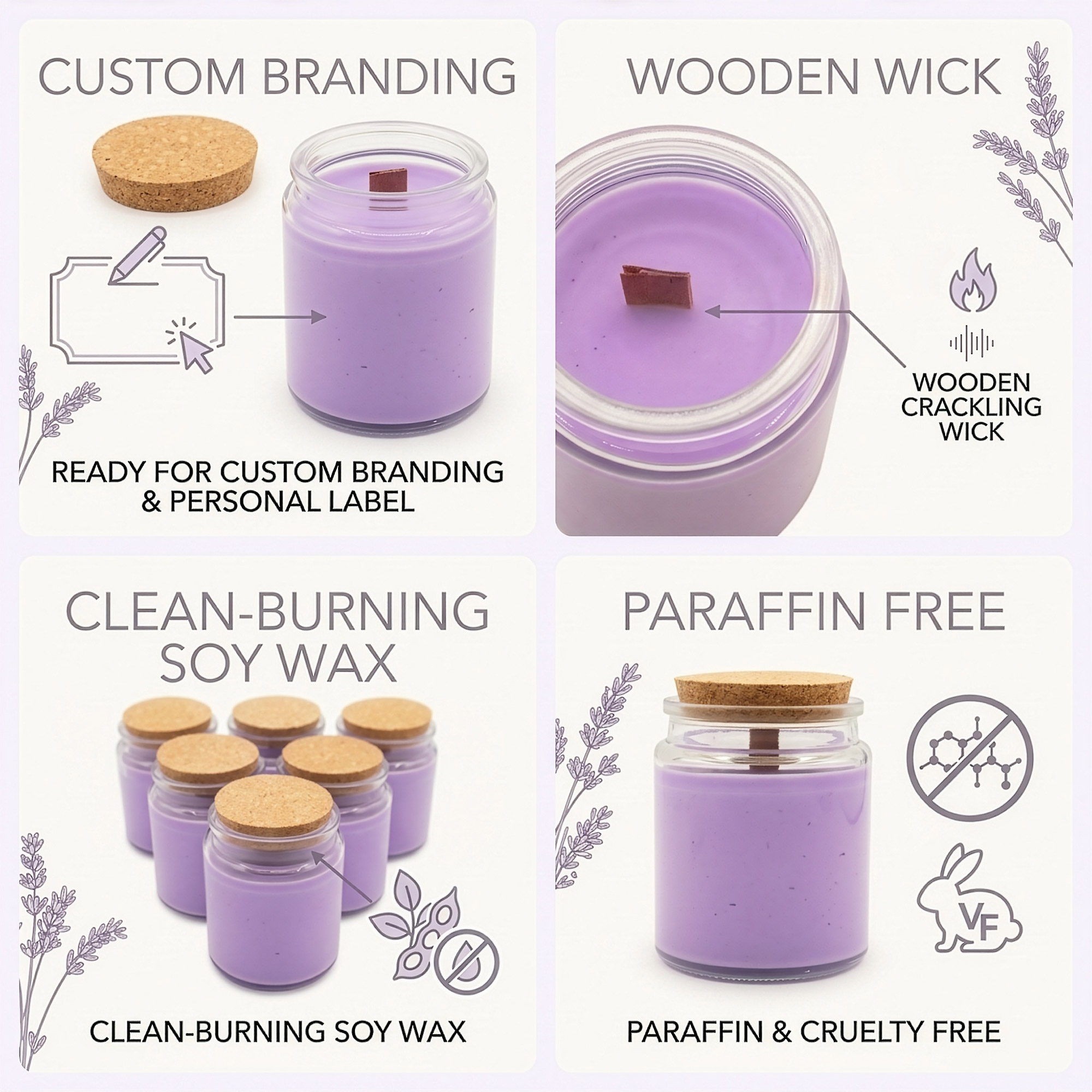 Infused with the timeless, soothing scent of fresh lavender, this candle is engineered to create a relaxing sanctuary in any home. The natural wooden wick provides a steady, clean burn and a signature crackling sound, mimicking the cosy ambiance of a miniature fireplace. Whether you are a boutique owner, a gift shop curator, or a lifestyle brand, the minimalist aesthetic of the Wild Lavender candle offers a premium "blank canvas" that lets your custom labeling and brand identity take center stage.