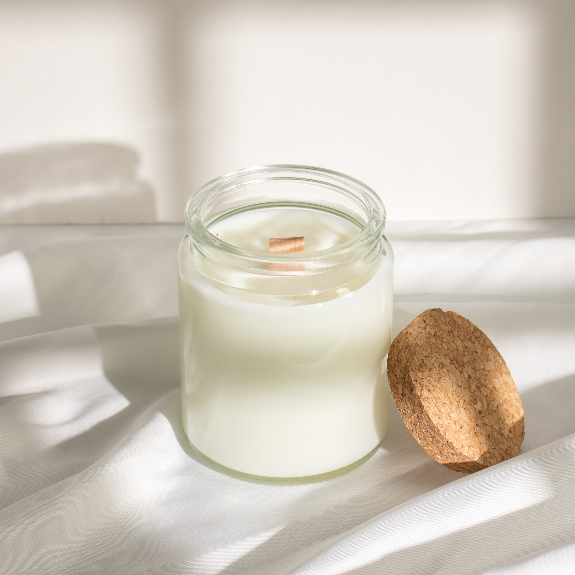 Expand your home fragrance collection with the crisp, comforting scent of Leaves and Linen. This unlabeled wood wick soy candle is the perfect solution for businesses seeking a sophisticated, ready-to-brand product that combines airy freshness with earthy undertones. The clean, neutral aesthetic of the clear glass jar and natural cork lid ensures this candle fits seamlessly into any brand's visual identity.