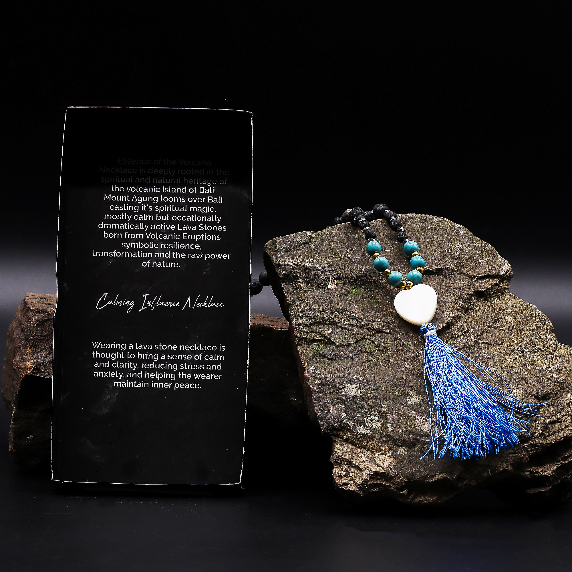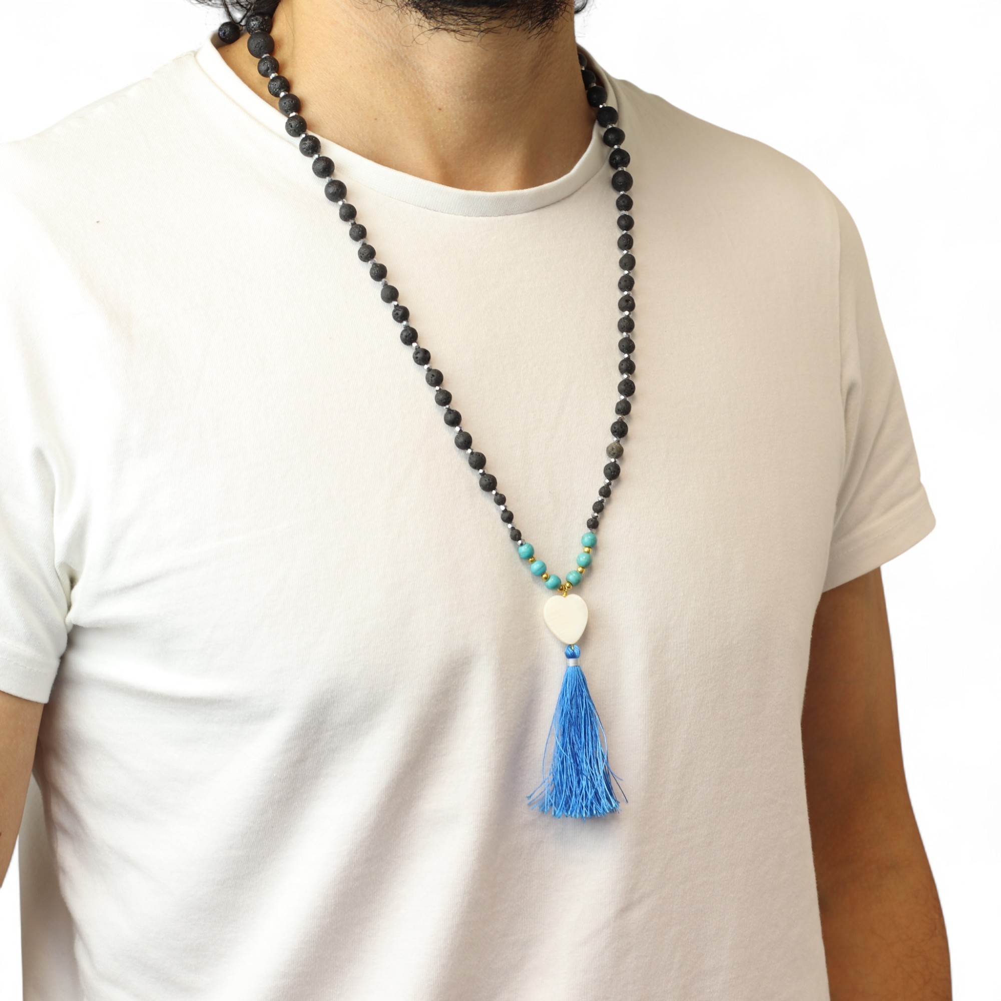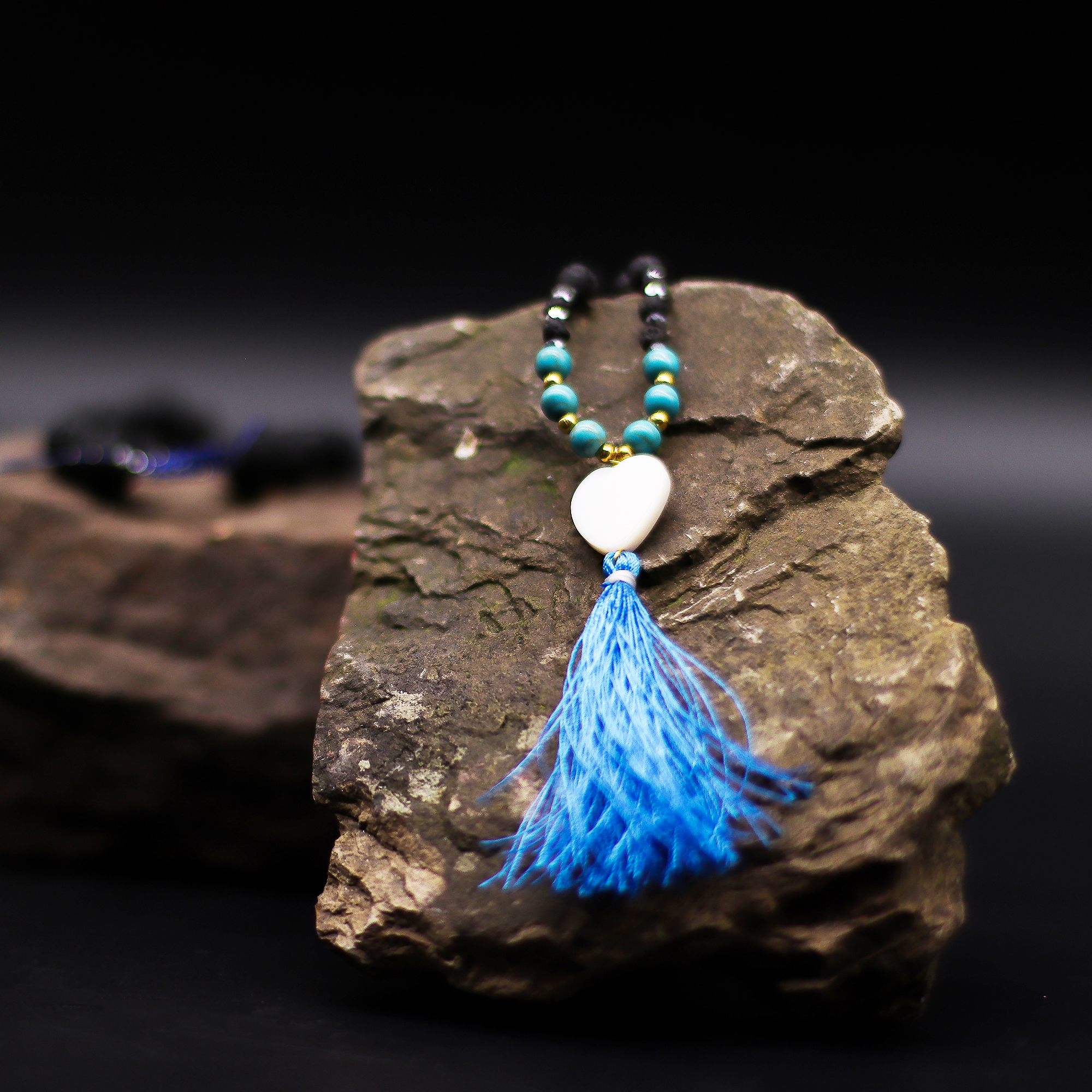 This necklace combines matte black lava stones with soothing turquoise beads and a blue tassel, creating a piece that’s both spiritual and stylish. Wearing it is believed to promote calm, reduce stress, and help the wearer maintain inner peace — making it an ideal gift or personal keepsake.