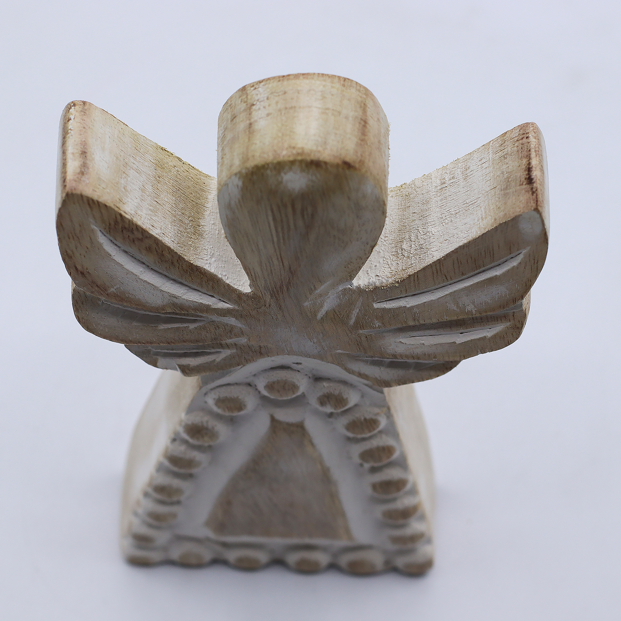 Add a touch of rustic serenity to any space with this charming whitewashed angel. Carved from natural mango wood and finished with a soft distressed effect, its gently rounded wings and textured robe create a warm, handmade look. Ideal for shelves, gift hampers, and festive displays.
