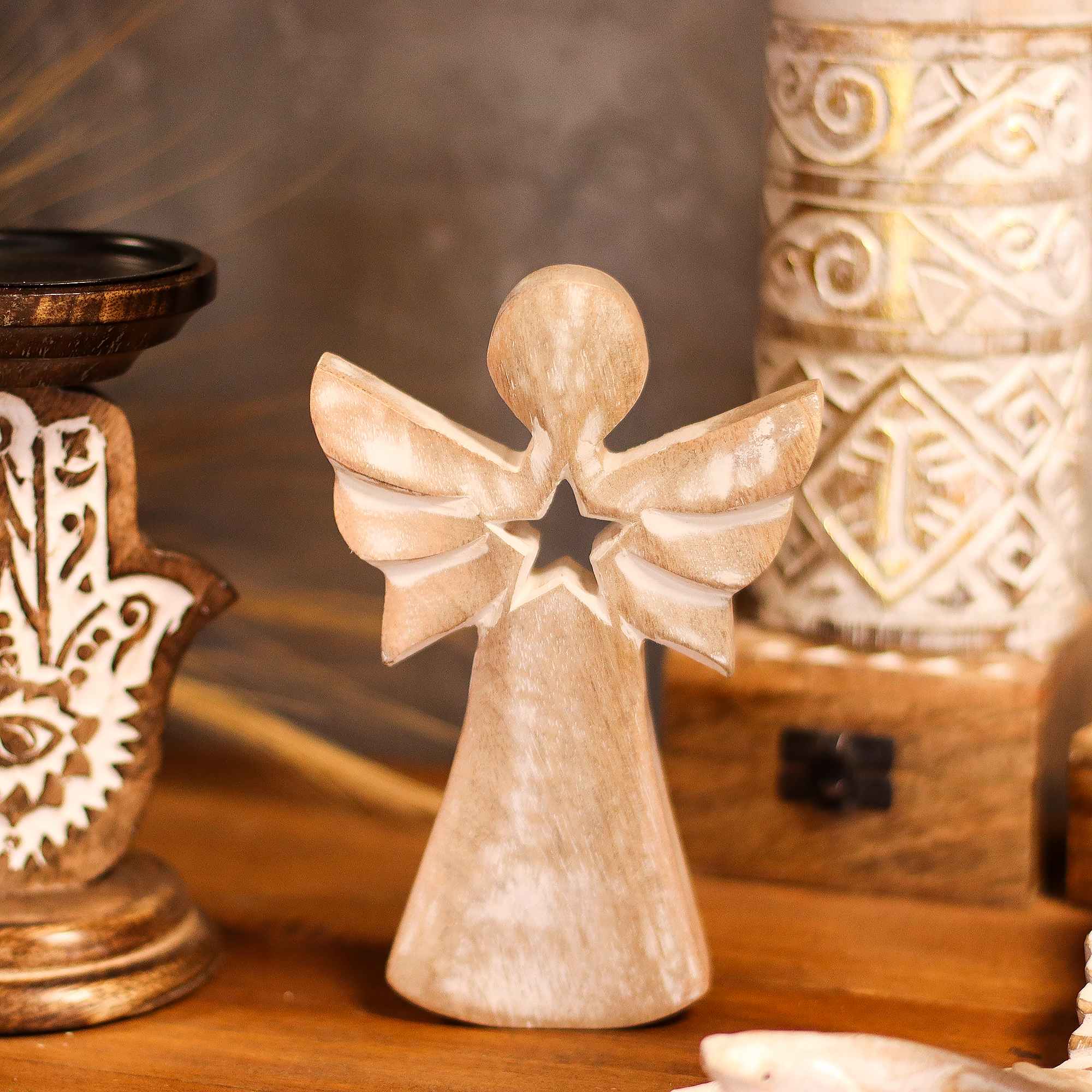 This serene angel brings a warm, celestial touch to any setting. Crafted from sustainable mango wood and gently whitewashed, it features a clean star-shaped cut-out at the heart, symbolising light and guidance. A beautiful piece for festive styling or meaningful gifts.