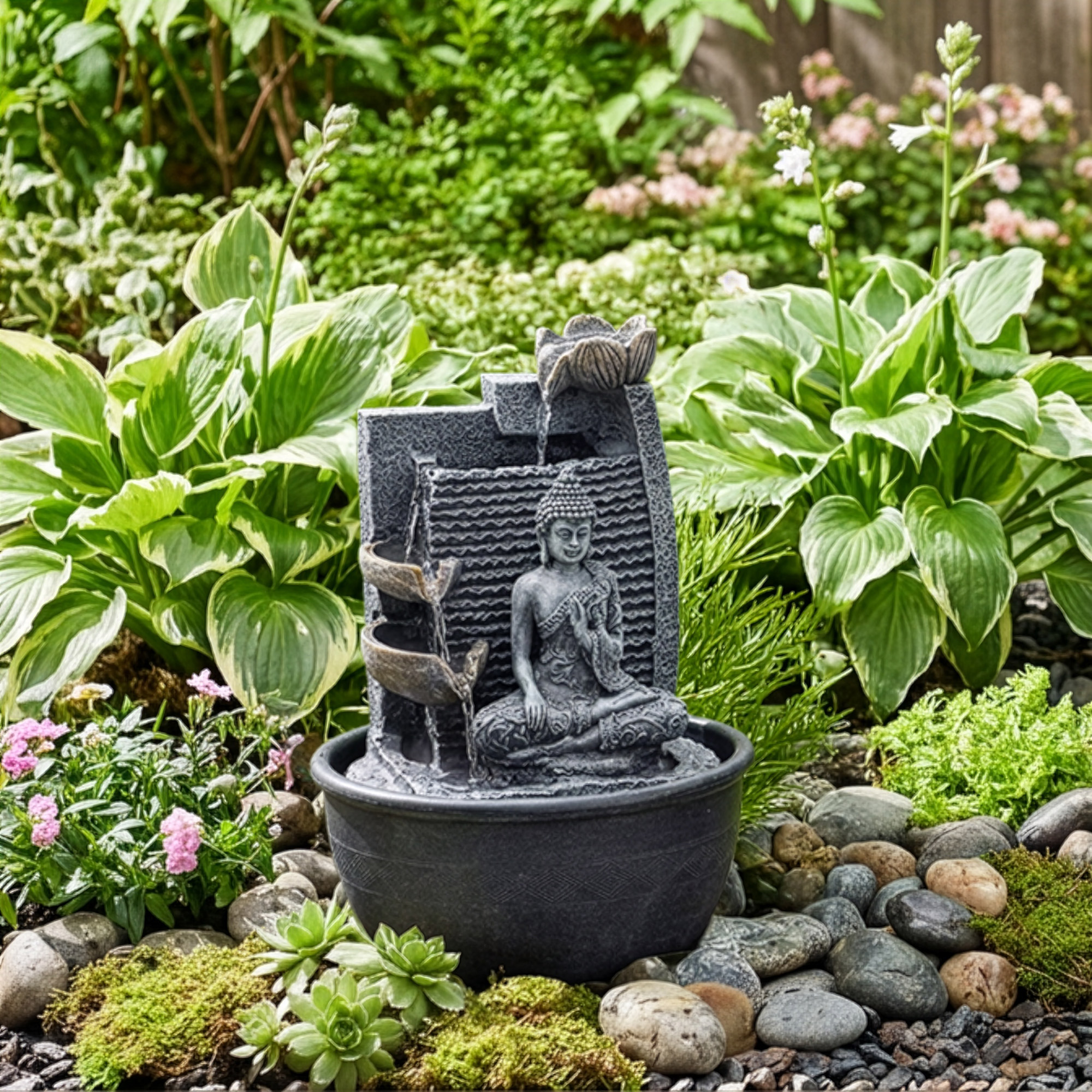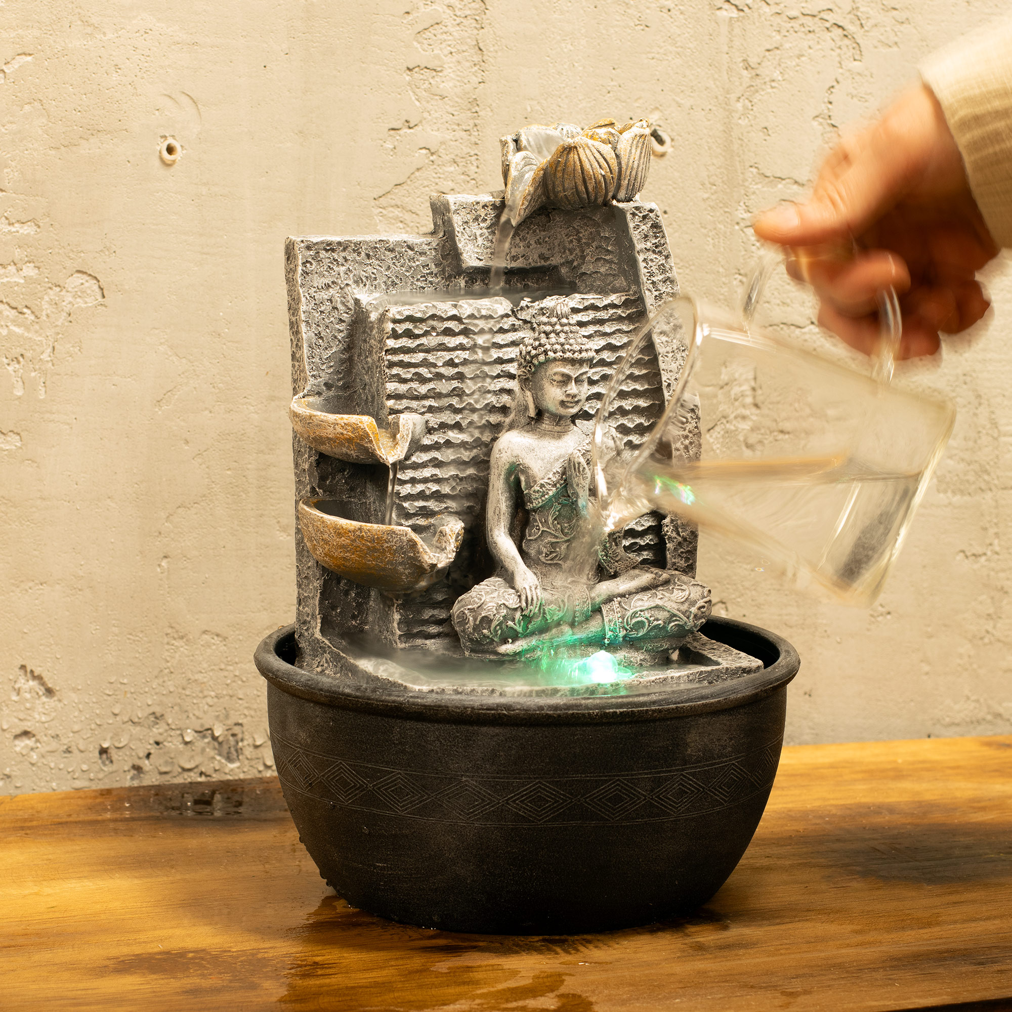 Bring a sense of calm and balance to interior spaces with this Tabletop Water Feature – Buddha, Lotus Flower Cascading Pots. The design centres around a seated Buddha figure, positioned in front of a textured stone-effect backdrop, with water gently flowing from lotus-inspired bowls into the basin below.