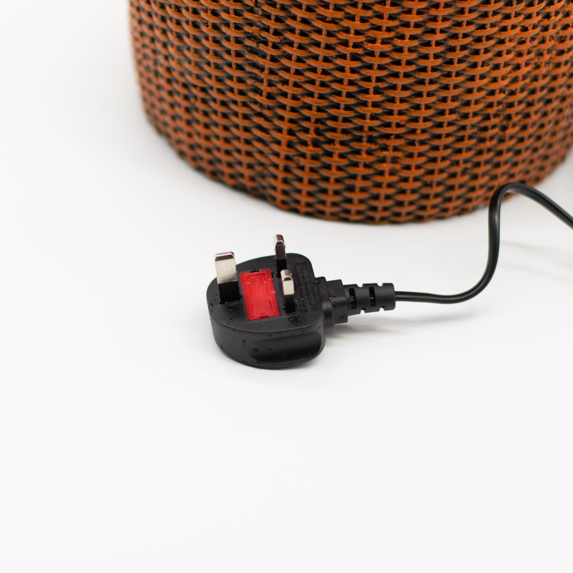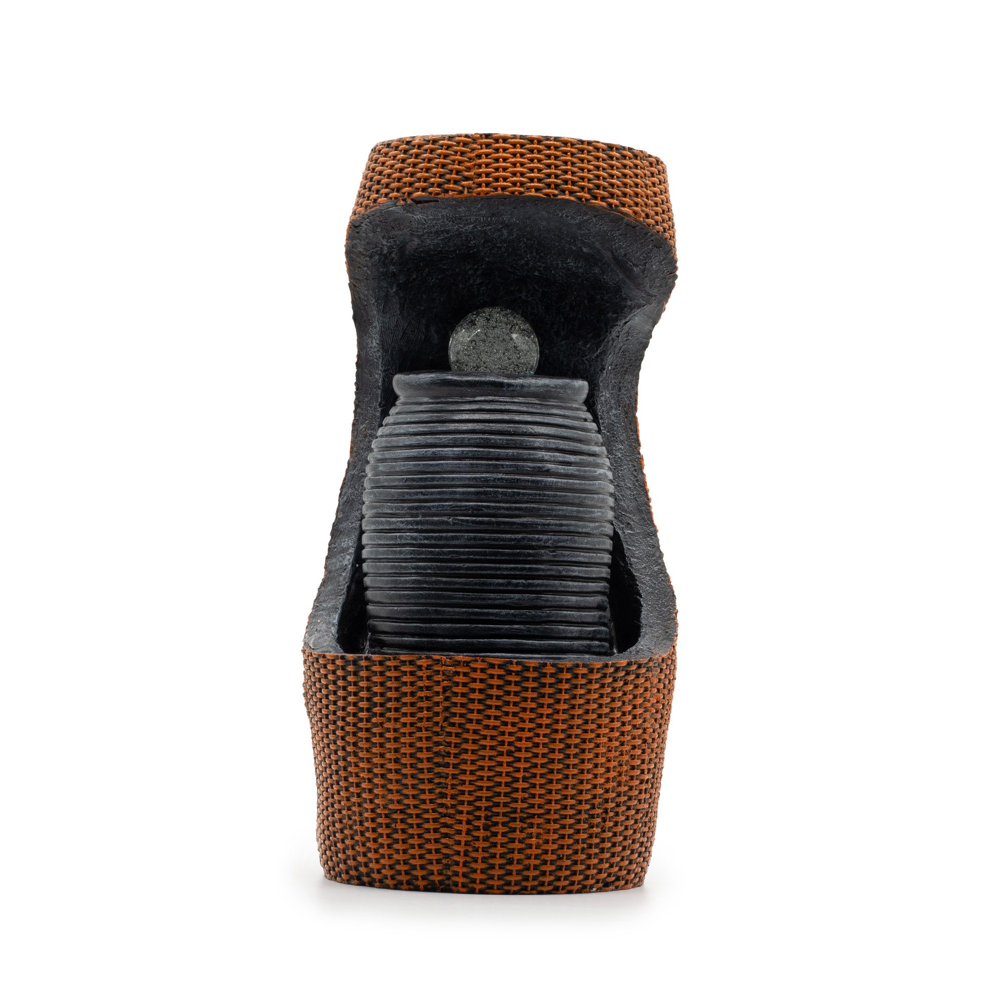 At the centre, water flows gently over the ribbed urn surface, guiding the eye upward to the crystal ball nestled at the top. Subtly illuminated with colour-changing LED light, the crystal ball reflects through the moving water, creating a calm, atmospheric glow that shifts as the colours change. The contrast between the dark stone-effect urn and the warm, woven basket texture adds depth and visual interest.