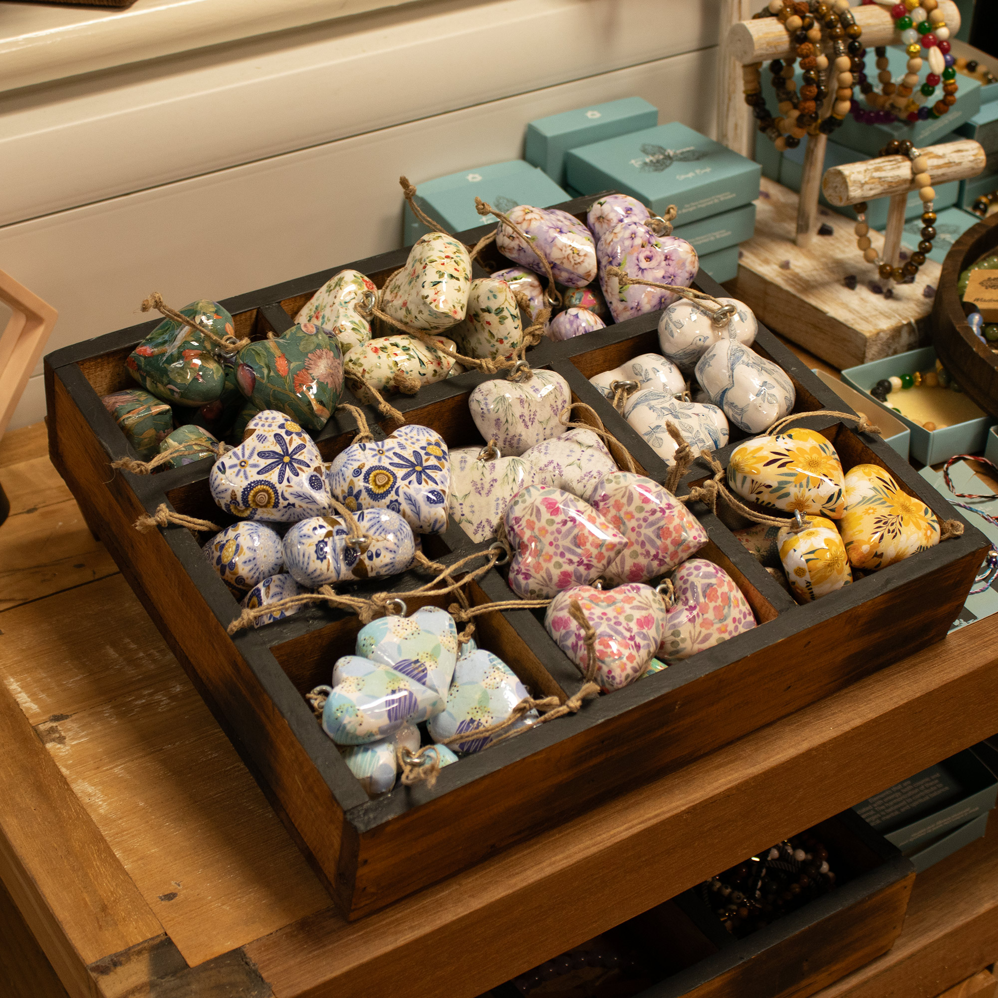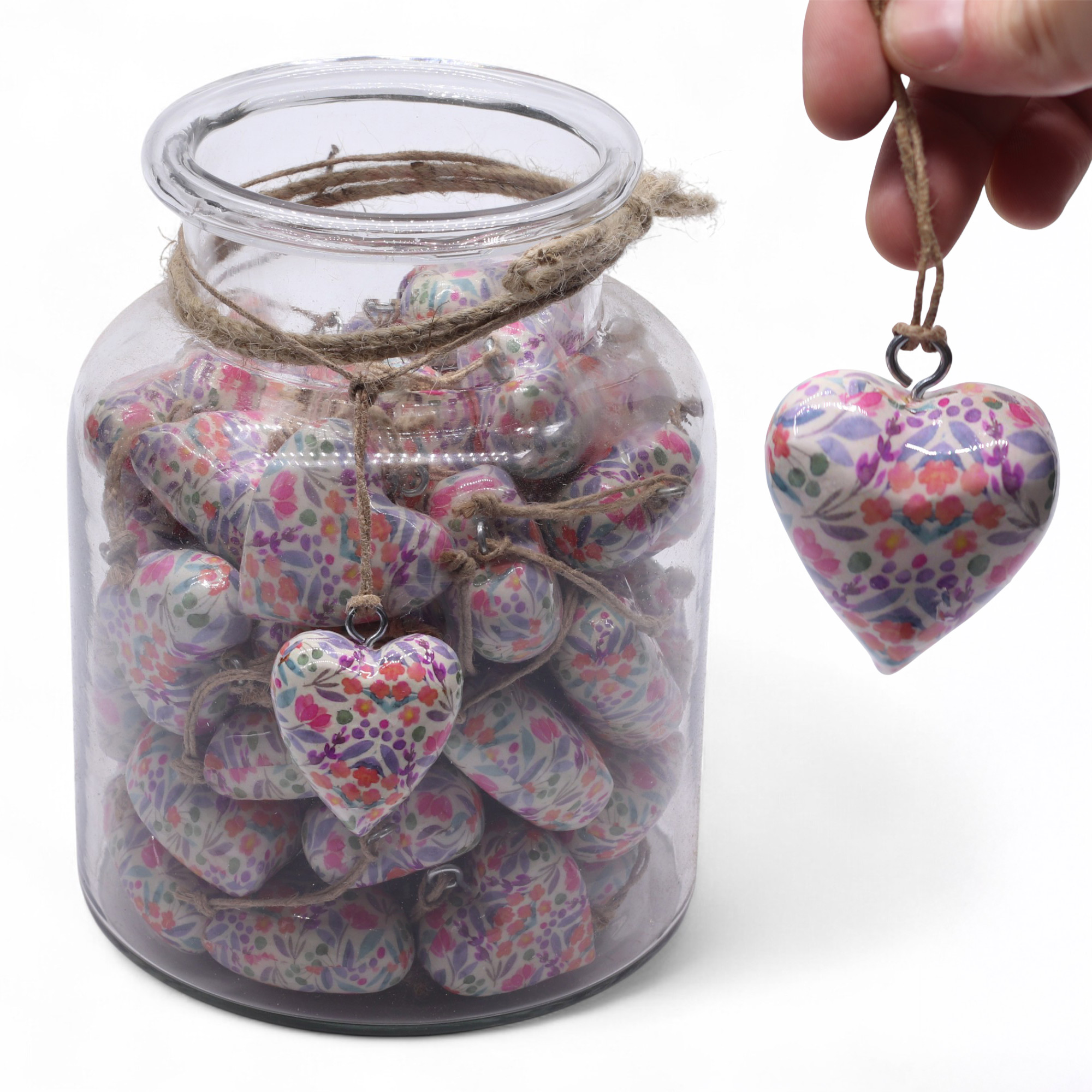 Delight your customers with this charming jar of 50 Large Decor Wood Hearts, each beautifully finished in a vintage pattern. Crafted from wood and coated in glossy enamel, these hearts make perfect gifts, keepsakes, or décor accents.