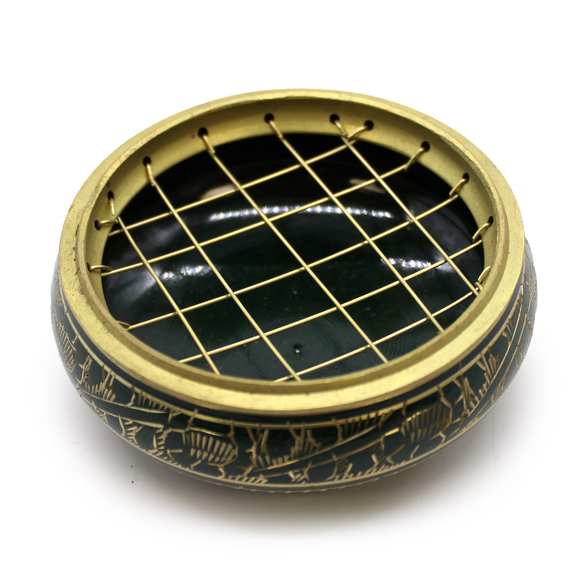 Charcoal Incense Jar in beautiful green colour. Decorated with golden patterns, handmade in India. This incense jar can be used during rituals for purification or activation of the Heart chakra.
