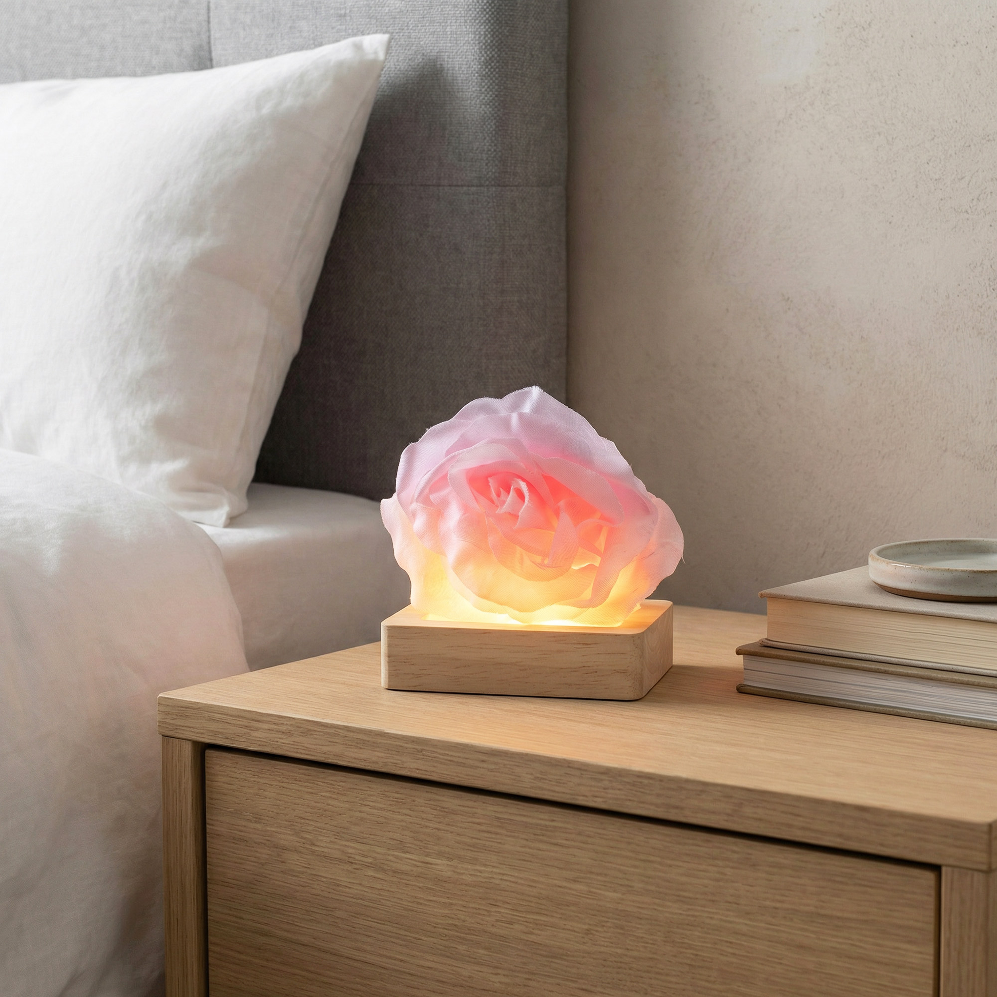 Each stand features a low-profile wooden base with integrated LED lighting and an inline on/off switch. No fixing or assembly is required – simply place the item on top and plug in. The light naturally travels through translucent, semi-translucent, or textured materials, creating dramatic effects with minimal effort.